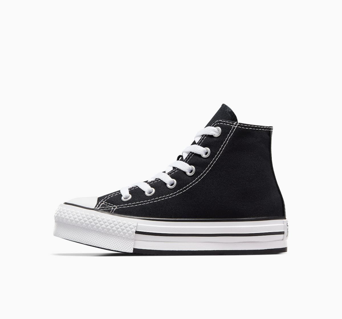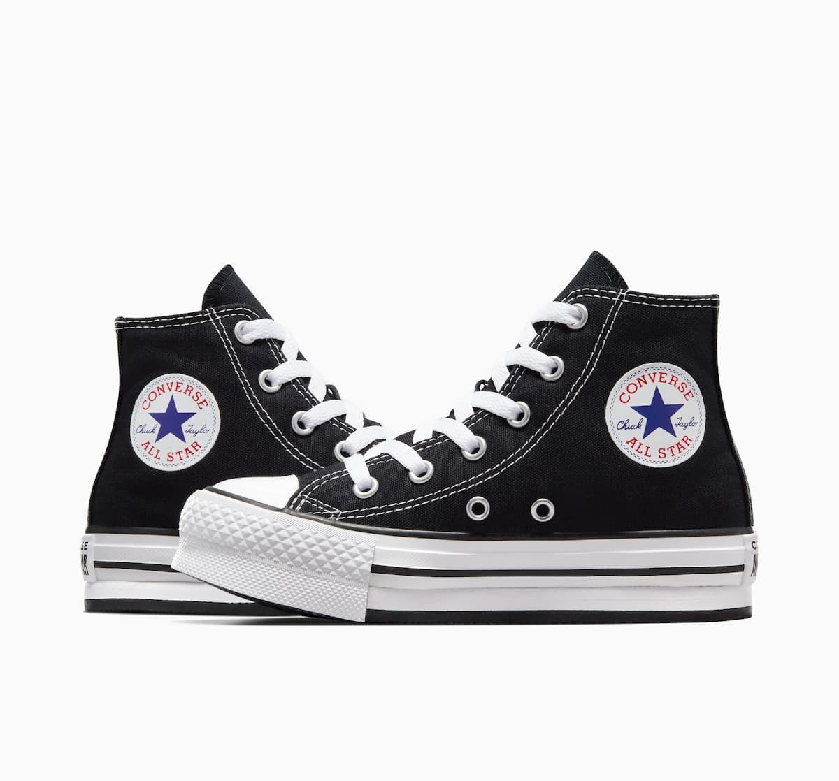 Las deportivas Chuck Taylor All Star de plataforma EVA Lift Canvas High Top negras y blancas cuentan con una plataforma de espuma EVA para un estilo más elevado, junto con detalles clásicos de las Chuck Taylor de siempre como la parte superior de lona transpirable, ligera y resistente, perfil alto, los dos ojales metálicos en la zona media para mejorar la circulación del aire, puntera de goma reforzada, las rayas en contraste de la entresuela, suela exterior de goma con patrón de agarre en forma de diamante, el logo Converse All Star impreso en el talón y el icónico parche All Star en el tobillo.