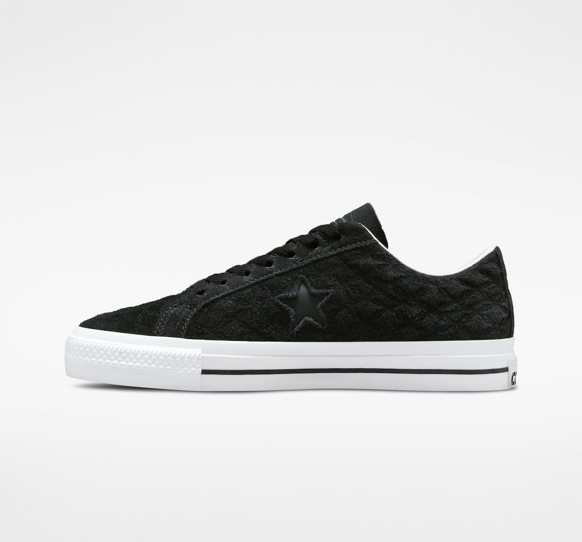 Las Converse One Pro Bones negras y blancas cuentan con un perfil bajo para una flexibilidad máxima, parte superior de ante con refuerzo de goma, lengüeta elástica para que se mantenga en su sitio, amortiguación de espuma CX para mayor protección contra impactos, suela de goma de tracción para un agarre óptimo, cordones blancos de polialgodón para mayor durabilidad, estampado integral en relieve de huesos en referencia a las raíces del skateboarding y el icónico logotipo One Star en el lateral.
