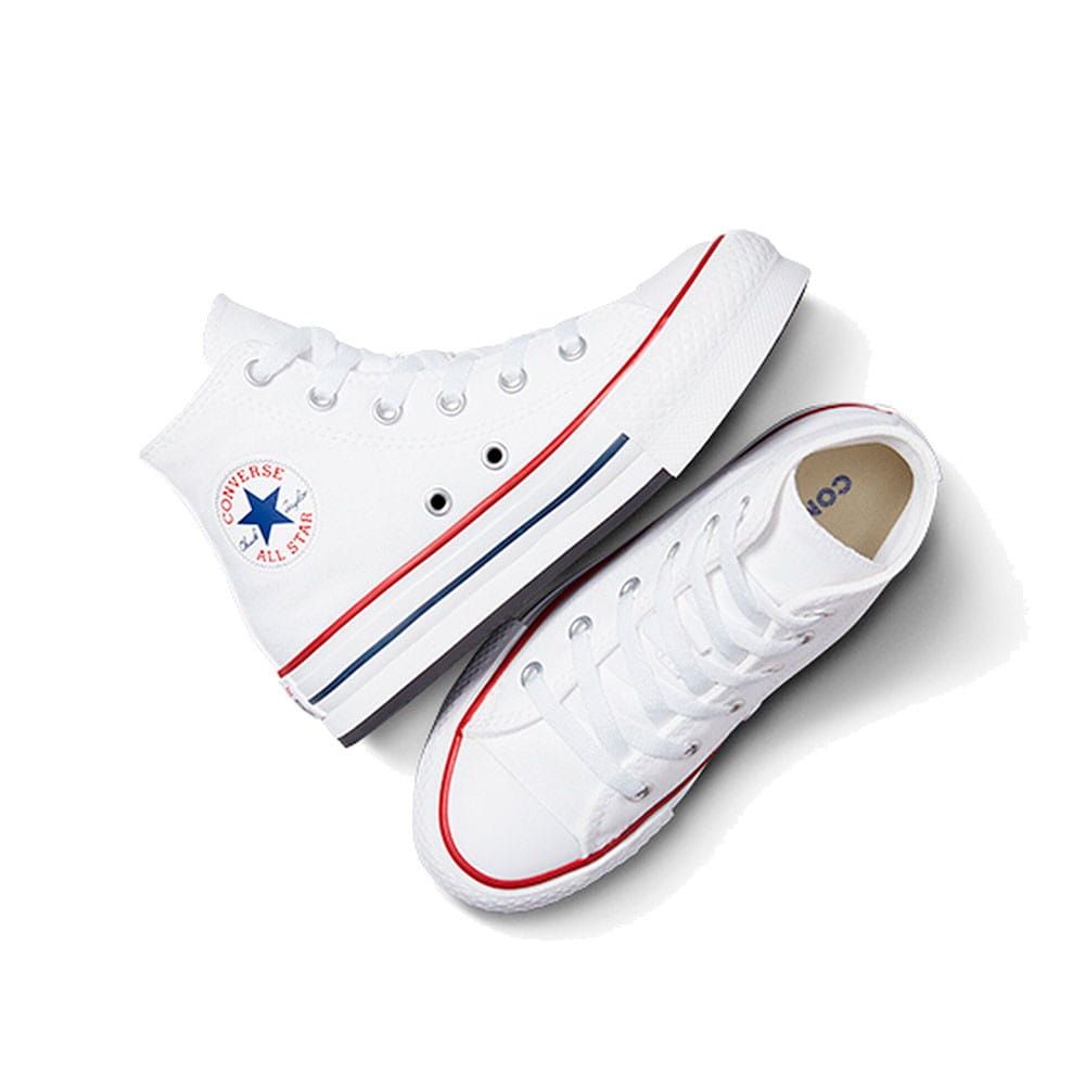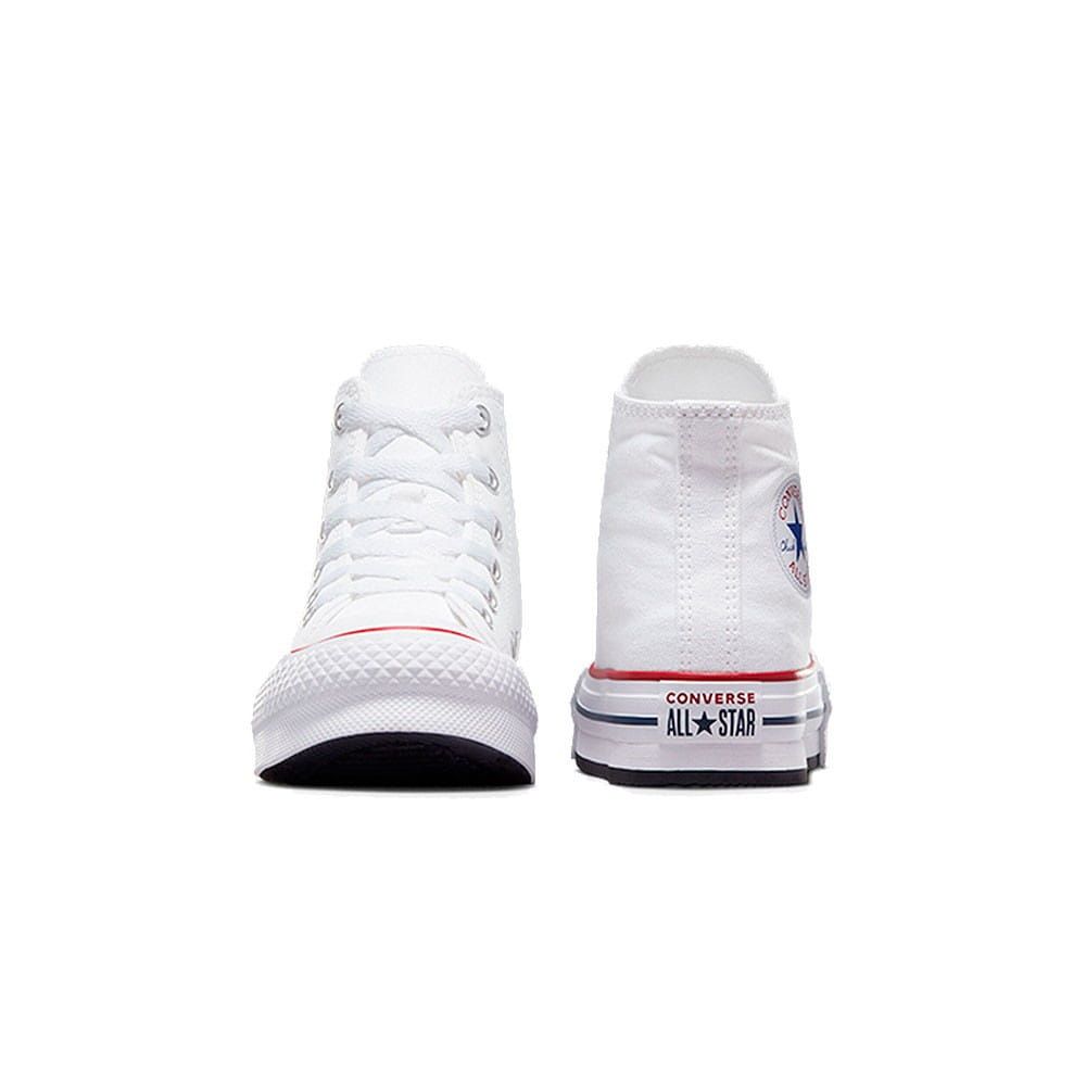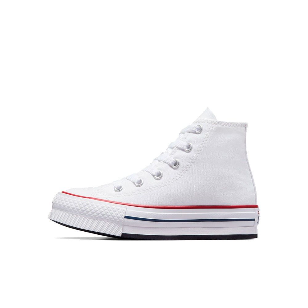 Las deportivas para niño/a de entre 4 y 7 años Chuck Taylor All Star de plataforma EVA Lift High Top blancas cuentan con una plataforma de espuma EVA para un estilo más elevado, junto con detalles clásicos de las Chuck Taylor de siempre como la parte superior clásica de lona transpirable, ligera y resistente, perfil alto, los dos ojales metálicos en la zona media para mejorar la circulación del aire, puntera de goma reforzada, las rayas en contraste de la entresuela, suela exterior de goma con patrón de agarre en forma de diamante, el logo Converse All Star impreso en el talón y el icónico parche All Star en el tobillo.