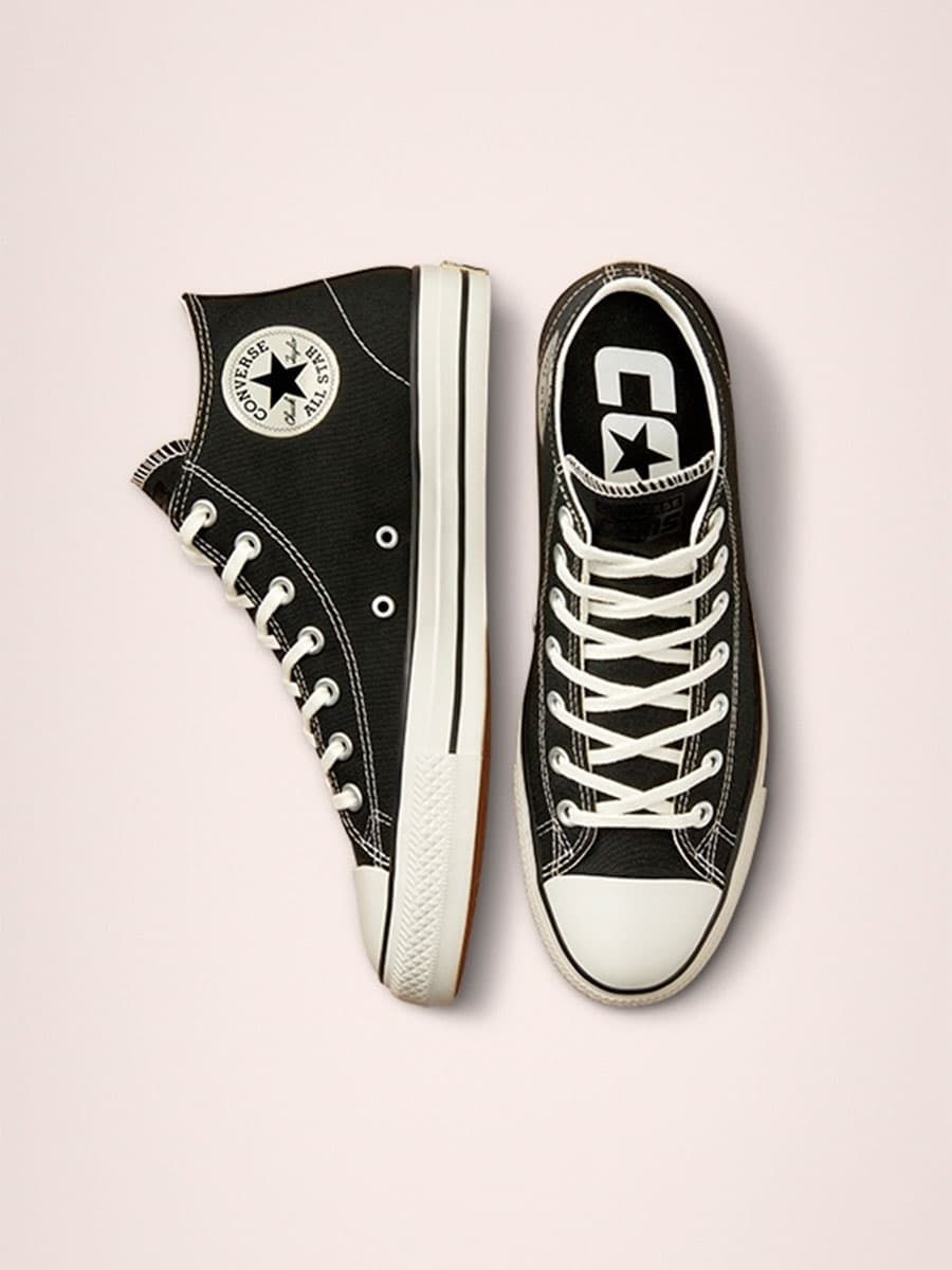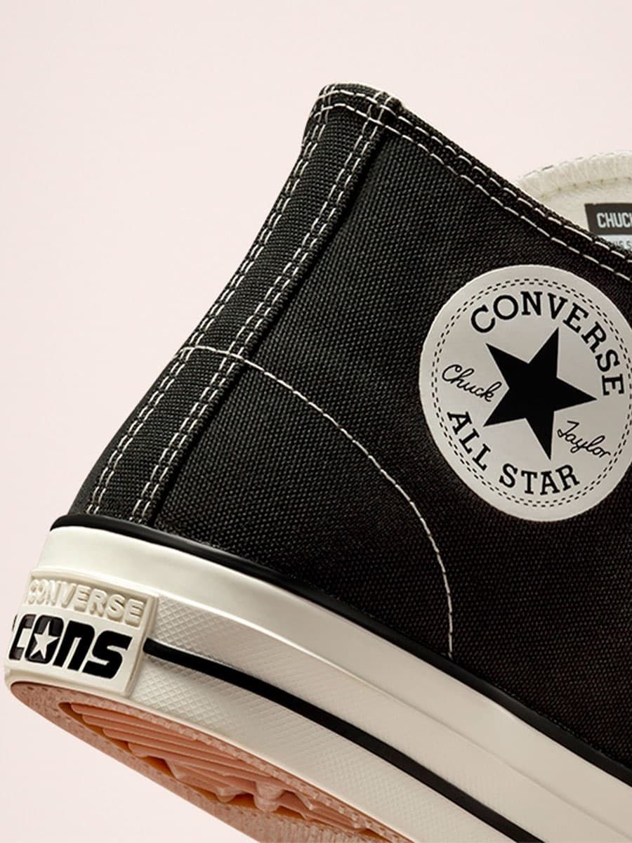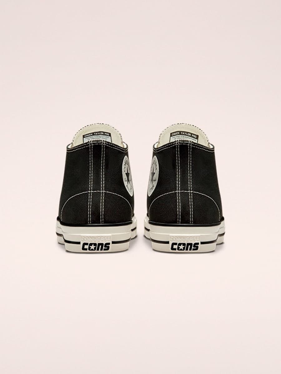 Las Converse CONS Chuck Taylor All Star Pro Cut Off Mid Top negras cuentan con parte superior de lona de poliéster 100% reciclado (rPET) recubierta de goma, plantilla de espuma CX moldeada para mayor amortiguación y protección contra impactos, suela de goma de tracción para un agarre óptimo a tu tabla de skate, los dos agujeros con borde metálico en la parte inferior característicos de las All Star y cordones blancos de polialgodón para mayor durabilidad.