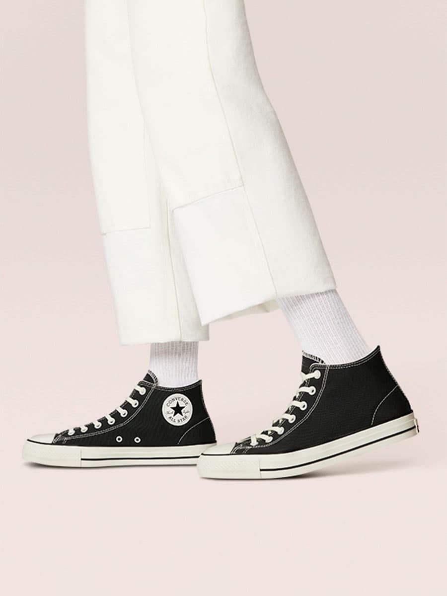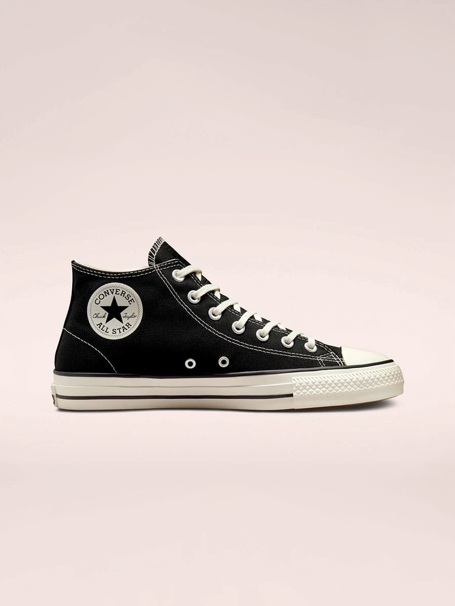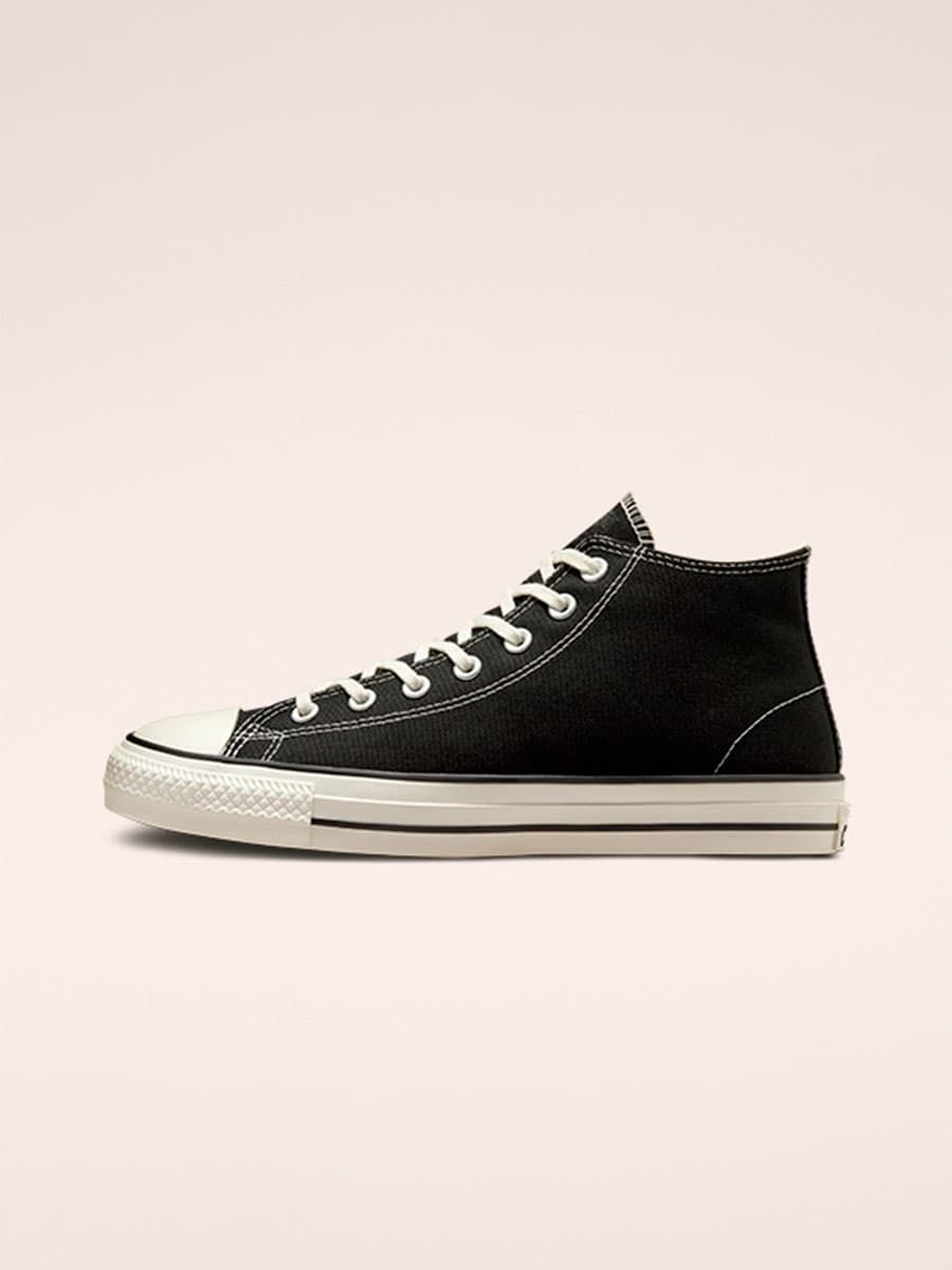 Las zapatillas CONS Chuck Taylor All Star Pro Cut Off Mid top en color negro (Black-Black-Egret) de Converse están confeccionadas con lona reciclada y goma.