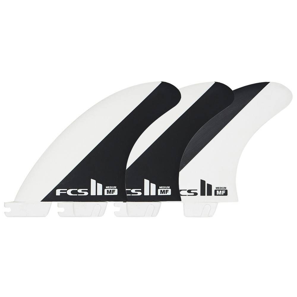 Las quillas para tabla de surf FCS II Mick Fanning PC Tri Fins en talla M y color blanco y negro tienen el logo de FCS estampado.