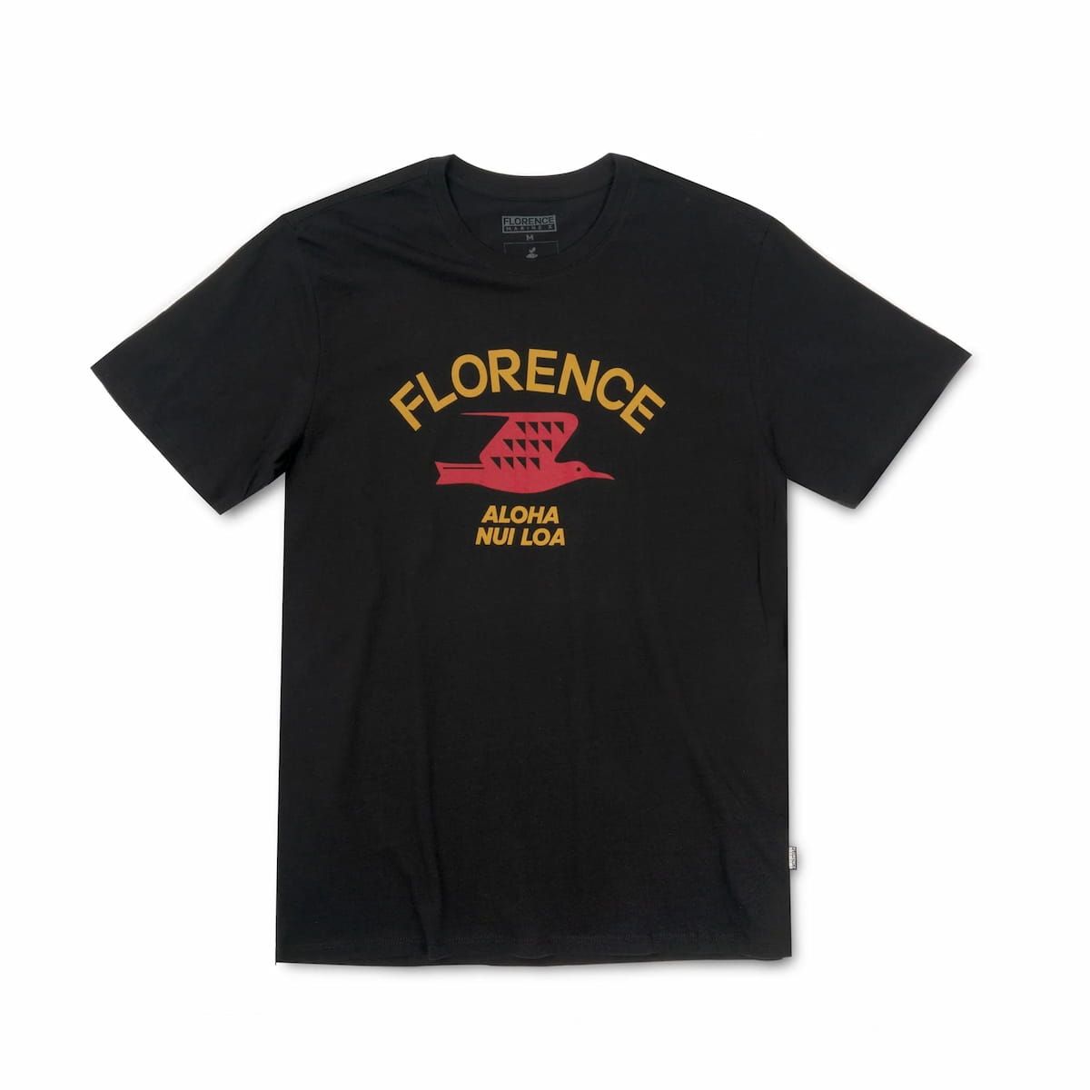Esta camiseta negra de corte normal cuenta con cuello redondo, manga corta y un gráfico de una gaviota con la inscripción FLORENCE - ALOHA NUI LOA serigrafiados en la parte delantera.