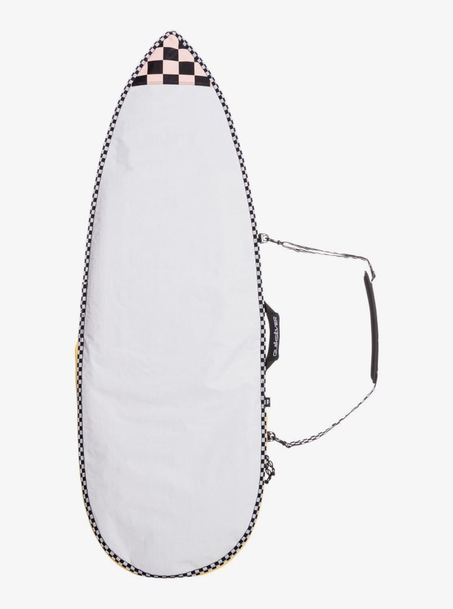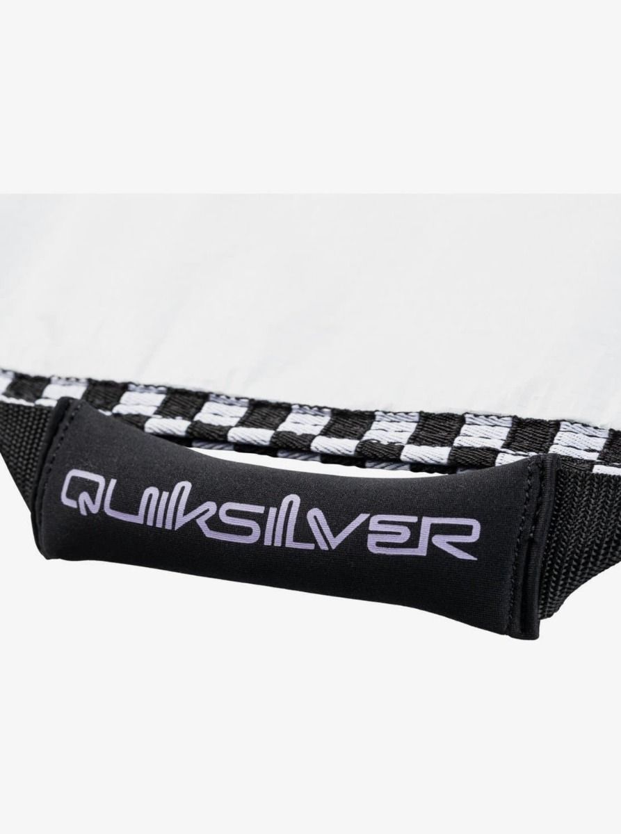 Esta bolsa de viaje para surfboard, recomendada para uso diario y misiones estrátegicas, cuenta con tejido interno plano de lona impermeable PE ultraresistente y ligero, acolchado interno de espuma PE de 3mm de grosor, contorno que se ajusta a la forma de tu tabla para reducir el exceso de tejido, refuerzo expansible para quillas, bolsillo para parafina, malla de ventilación y drenaje, asa de neopreno acolchada, correa de hombro acolchada ajustable, cierre de cremallera de plástico no corrosivo con deslizadores de nailon y el logo de Quiksilver estampado en la parte delantera y el asa de transporte.