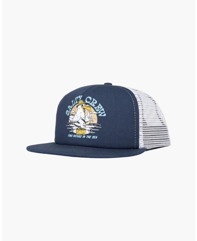 Esta gorra infantil estructurada cuenta con corona de altura media, visera plana, panel delantero de espuma acolchada, paneles laterales y traseros de malla blanca, cierre ajustable posterior con broche a presión de plástico y un gráfico original de Salty Crew de una gaviota y un pez con la inscripción "Find refuge in the sea" (Encuentra refugio en el mar) impreso en el panel frontal.