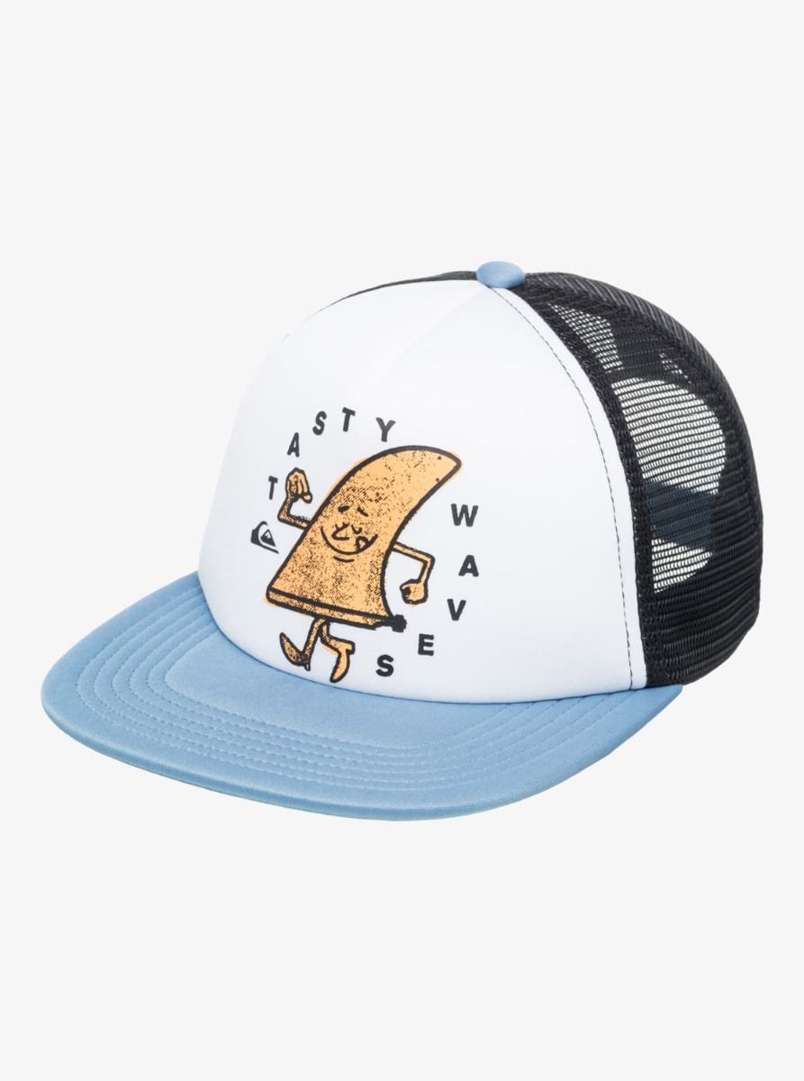 Gorra trucker para niño con visera plana, malla trasera y divertido gráfico Quiksilver. Comodidad y ventilación para el verano.