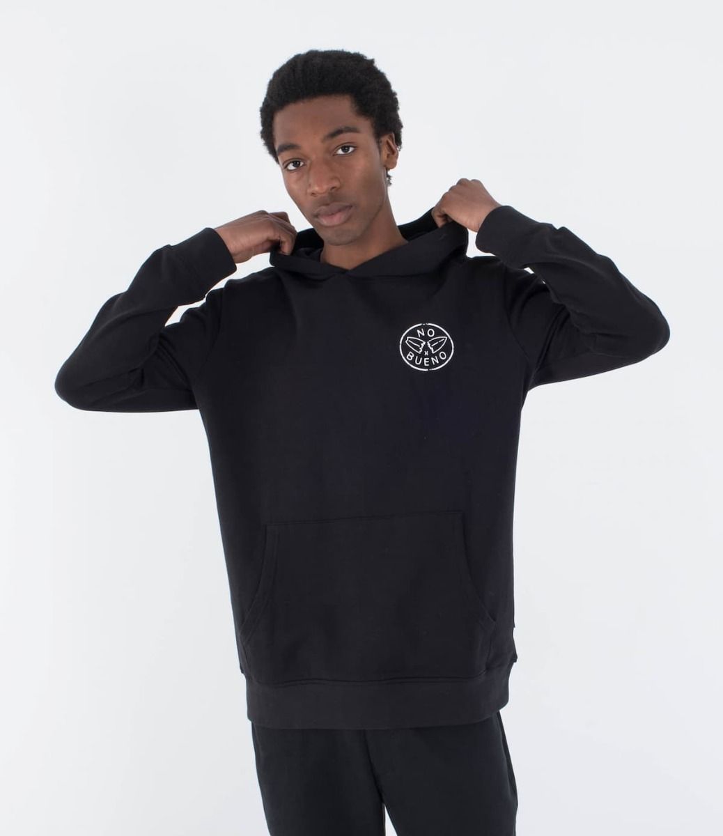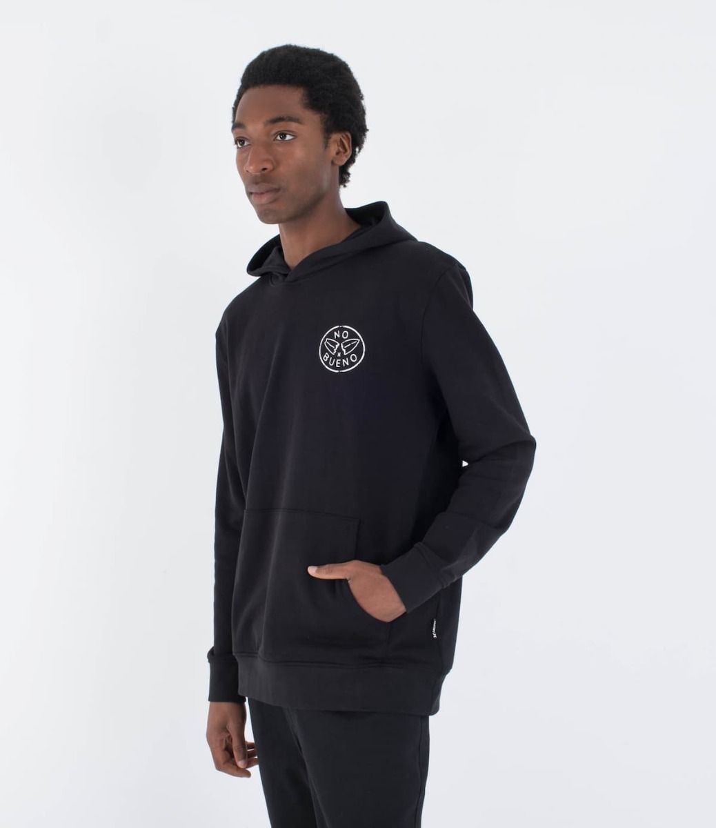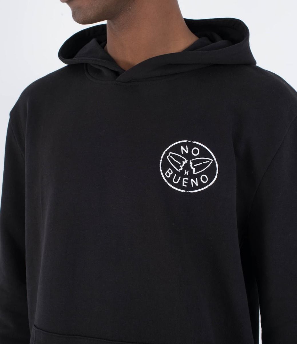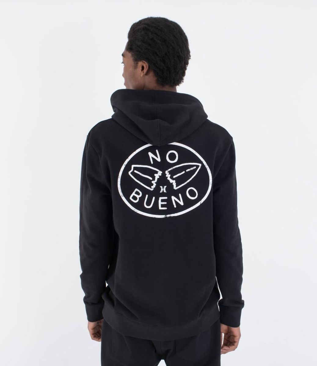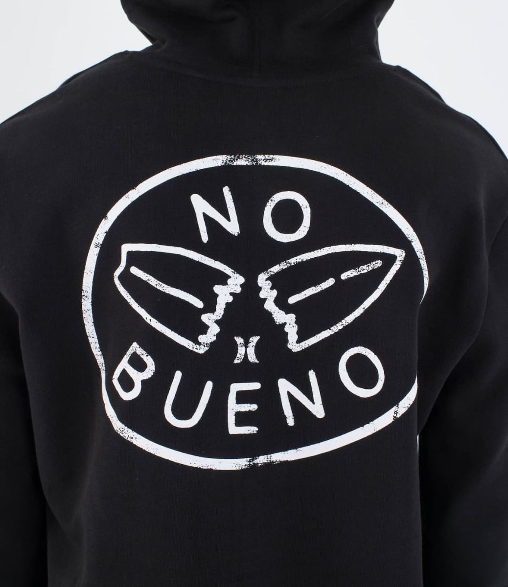 Su bolsillo tipo canguro y capucha aportan funcionalidad, mientras que su diseño único presenta un gráfico de una tabla de surf partida con la inscripción "No Bueno", estampado en el pecho y la espalda.