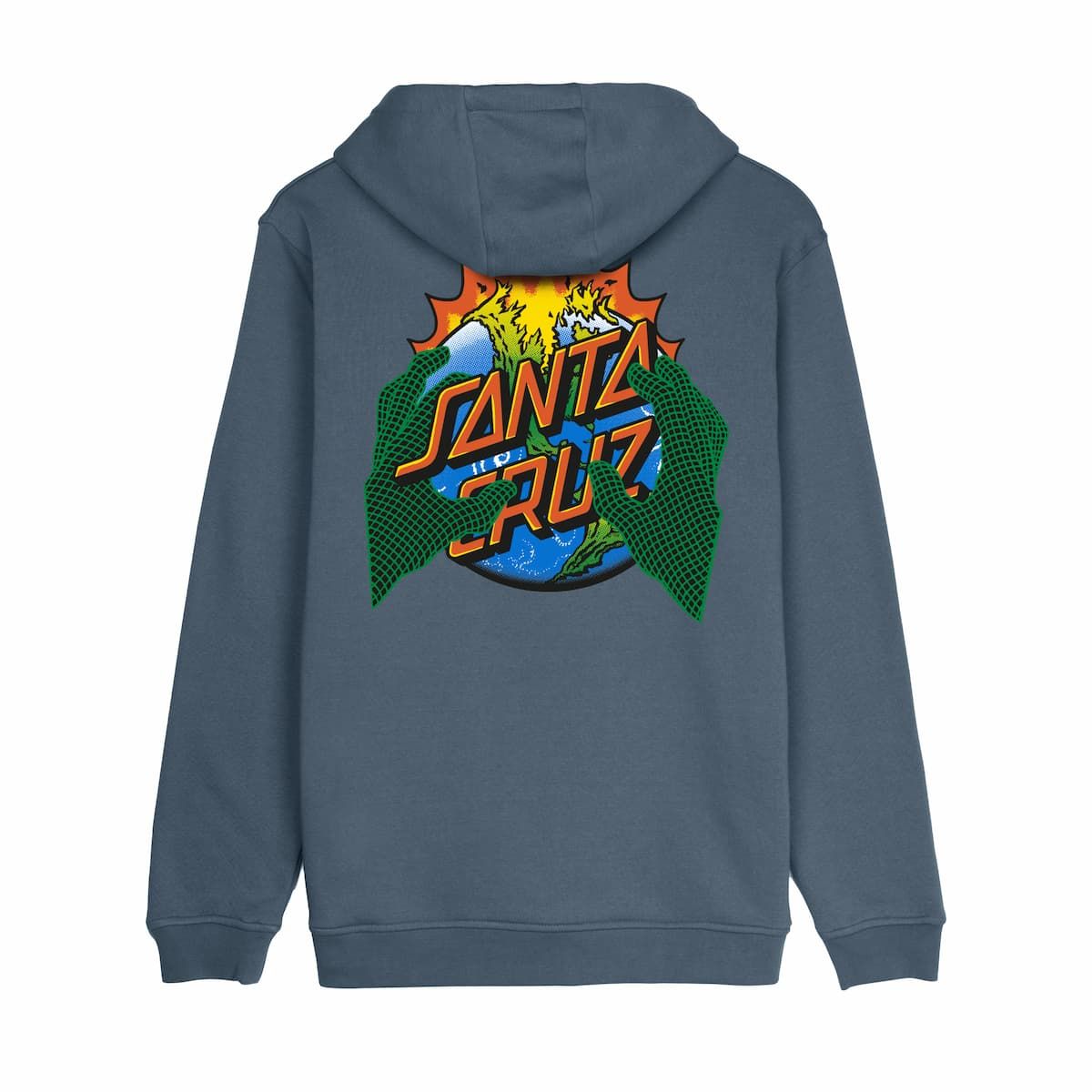 El icónico logotipo de Santa Cruz se reinterpreta con un diseño explosivo que ocupa toda la espalda: un planeta entre llamas sujetado por manos pixeladas en verde que emergen del gráfico, todo envuelto en una paleta de colores que grita cultura skate. En el pecho izquierdo se repite el logo a menor escala, manteniendo la coherencia visual.