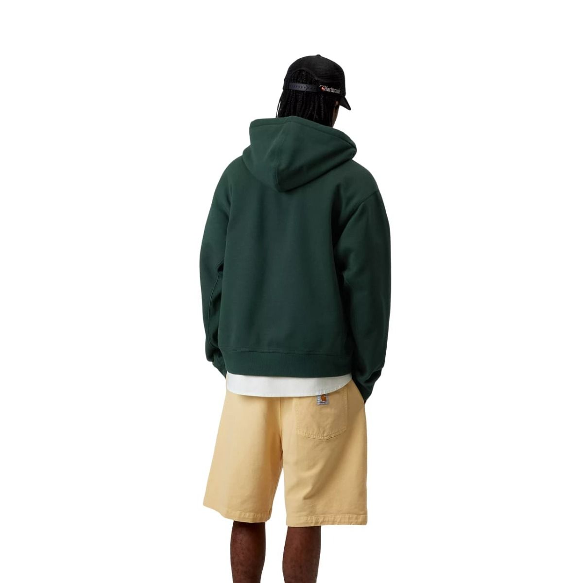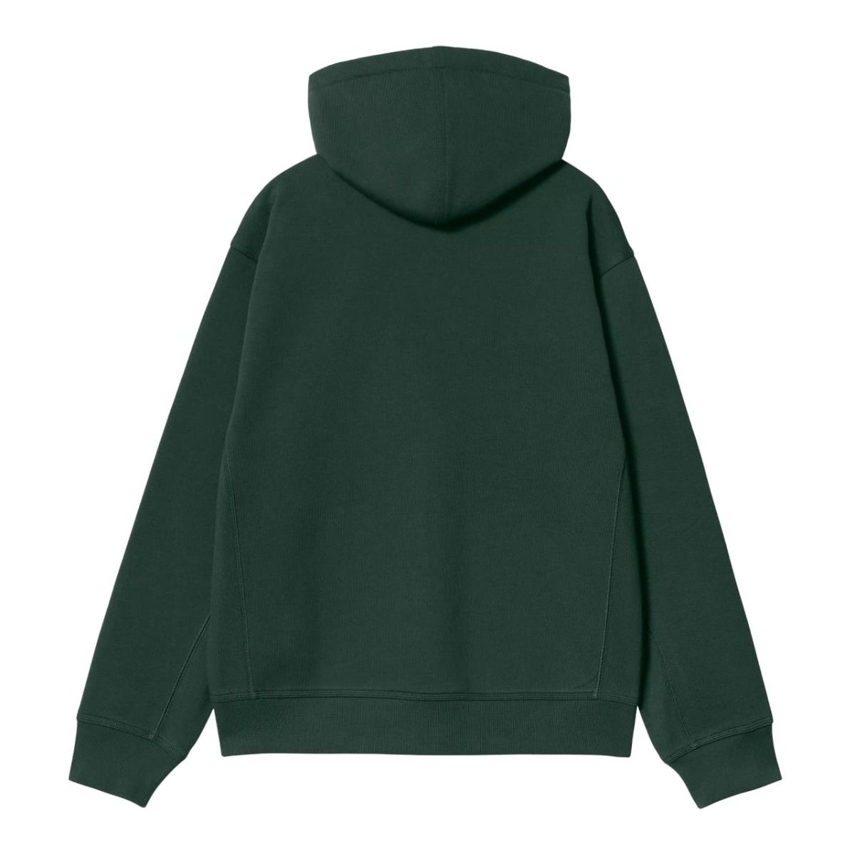 Esta sudadera verde conífera con cremallera tipo chaqueta cuenta con corte holgado, puños y bajo acanalados para un efecto ceñido, tejido cepillado para un acabado suave similar al forro polar, capucha ajustable mediante cordón, bolsillo tipo canguro, junto con el logotipo Carhartt bordado en dos tonos en el lado izquierdo del pecho.