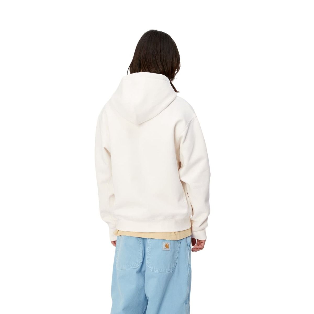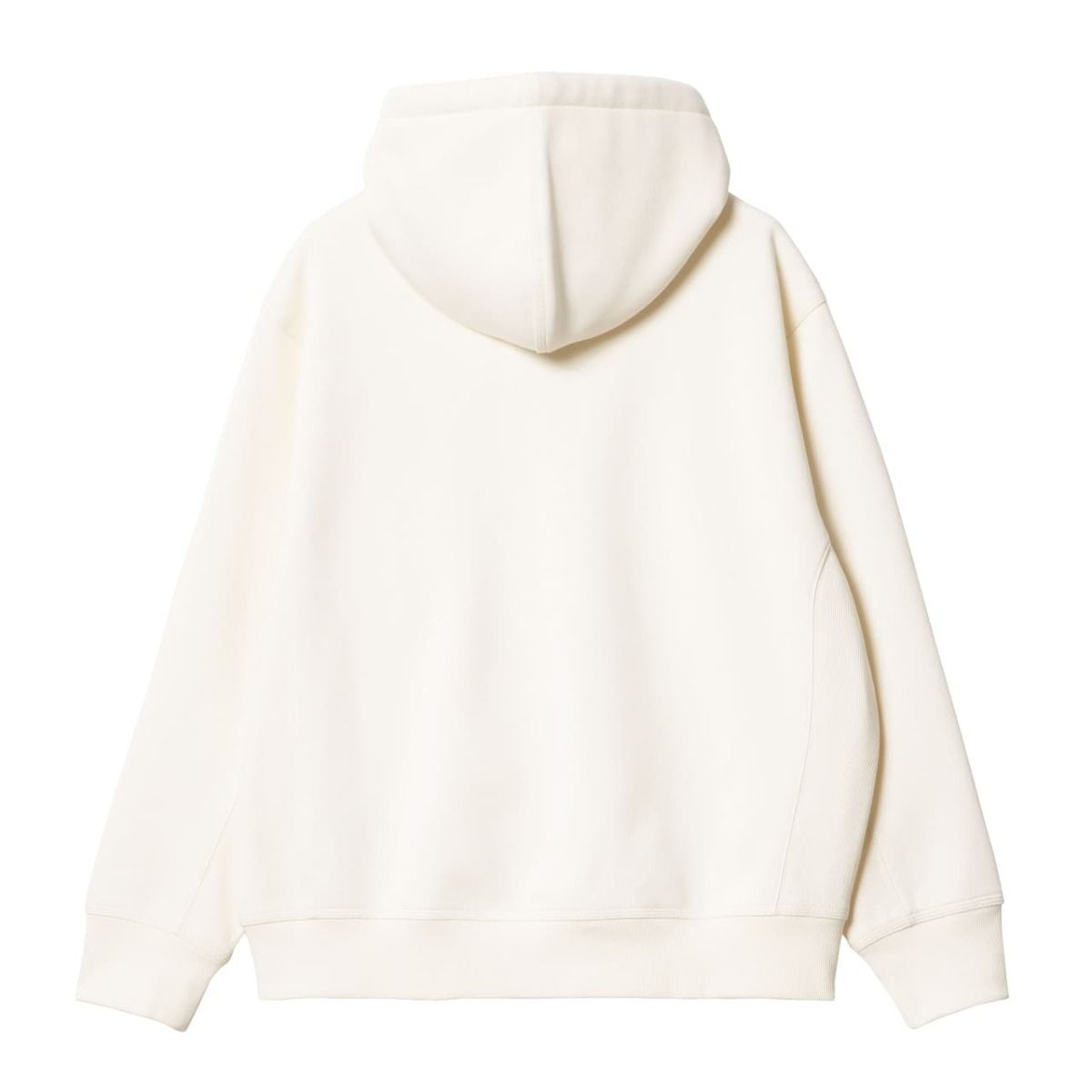 Esta sudadera blanca con cremallera tipo chaqueta cuenta con corte holgado, puños y bajo acanalados para un efecto ceñido, tejido cepillado para un acabado suave similar al forro polar, capucha ajustable mediante cordón, bolsillo tipo canguro, junto con el logotipo Carhartt bordado en dos tonos en el lado izquierdo del pecho.