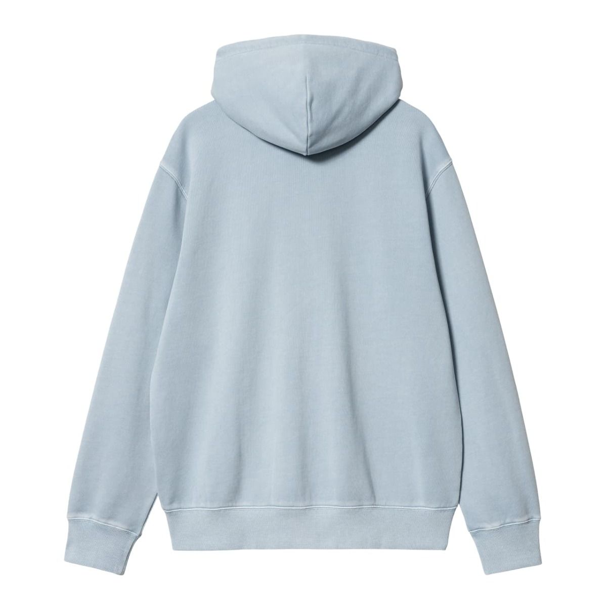 Esta sudadera azul celeste con cremallera tipo chaqueta cuenta teñido en prenda (Garment Dyed) para un tacto más suave y un aspecto lavado, corte holgado (loose), puños y bajo acanalados para un efecto ceñido, capucha ajustable mediante cordón, bolsillo tipo canguro, junto con el logotipo Carhartt bordado en el mismo tono en el lado izquierdo del pecho.