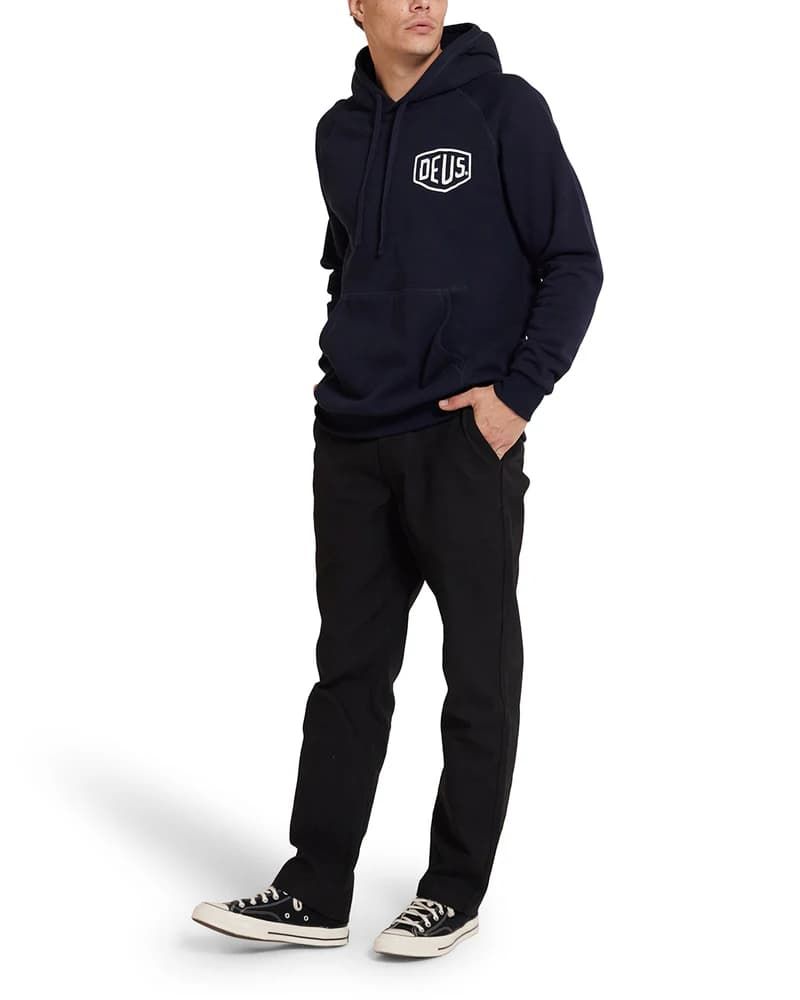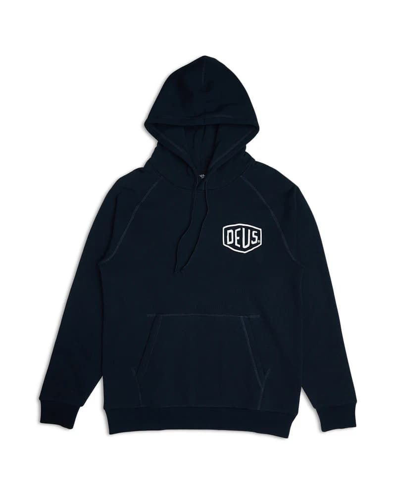 La sudadera con capucha para hombre Tokyo Address Hoodie en azul marino (Navy) de Deus Ex Machina está confeccionada con tejido de algodón orgánico cepillado (350g).