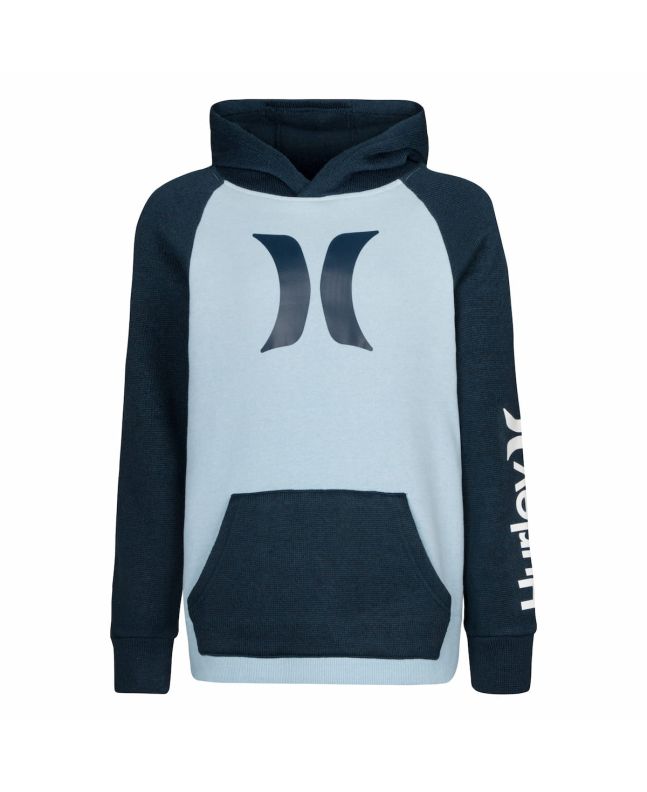 La sudadera de capucha para niños de 6-14+ años Naturals Icon Boys Pullover en tono azul celeste y azul marino de Hurley es la combinación perfecta de look deportivo y comodidad para los más jóvenes. Con un diseño de mangas raglán en contraste de color azul marino y serigrafía en el pecho y la manga, esta sudadera ofrece un estilo dinámico y funcional para el día a día.