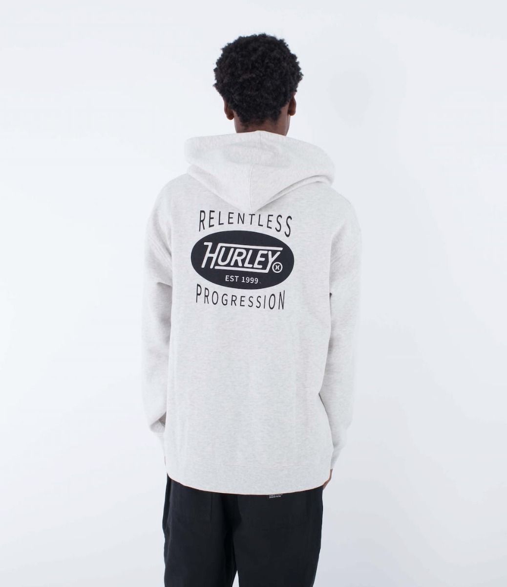 Esta hoodie de corte oversize cuenta con forro interior polar, capucha forrada ajustable mediante cordones, puños y bajo inferior acanalados, un bolsillo tipo canguro, junto con serigrafiado suave sin PVC ni ftalatos "Relentless Progression - Hurley Est 1999" impreso en el lado izquierdo del pecho y en la espalda.
