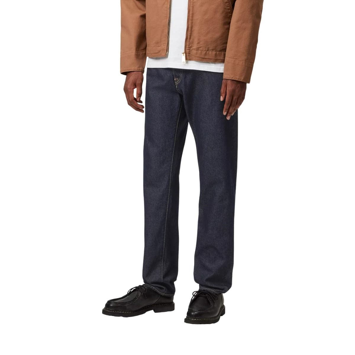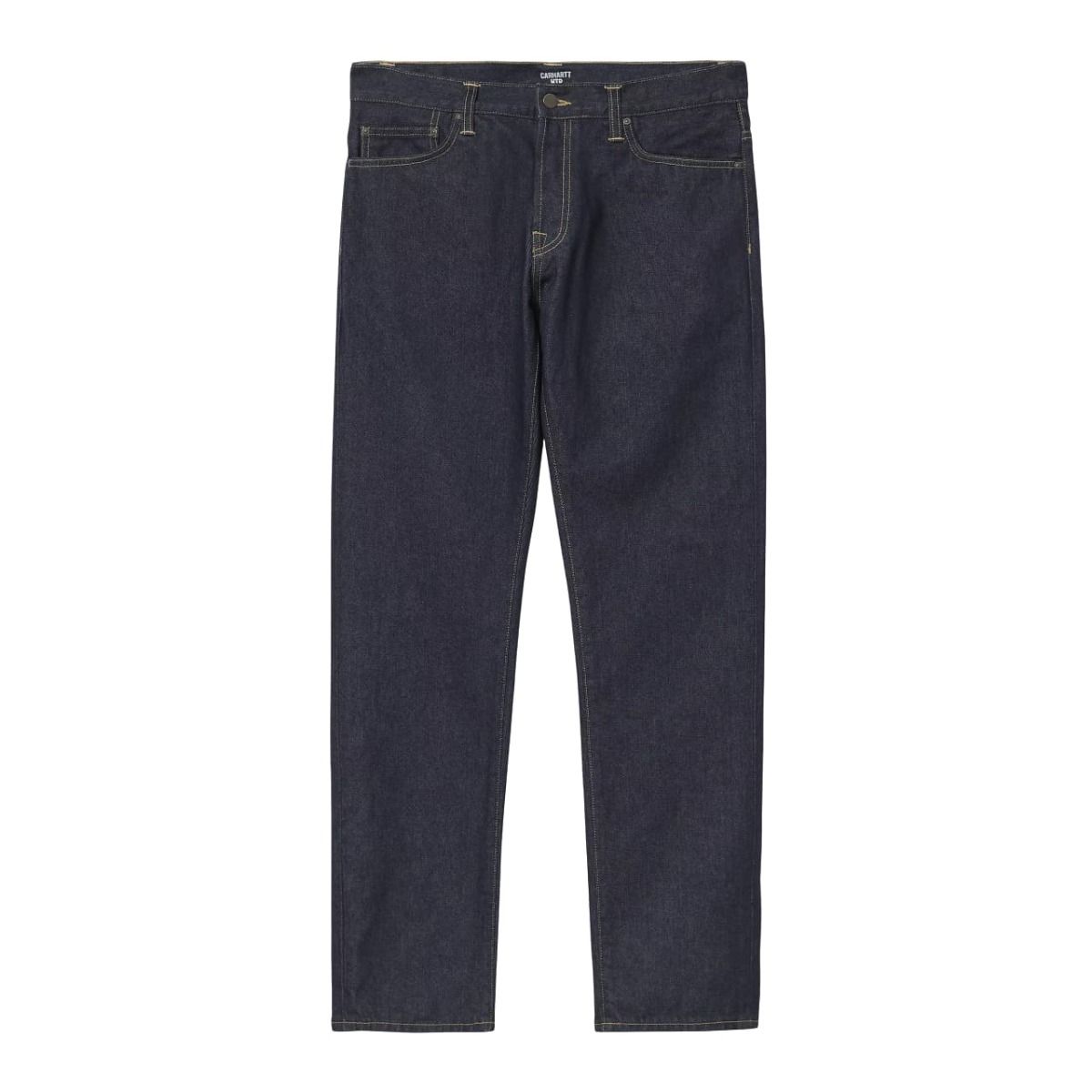 Jeans Carhartt WIP Klondike Blue (One Wash) en denim orgánico de 13,5 oz. Corte regular ajustado, tiro bajo y bragueta de botones.