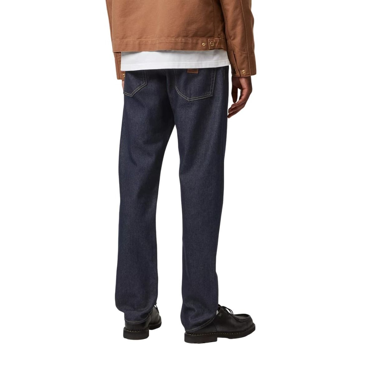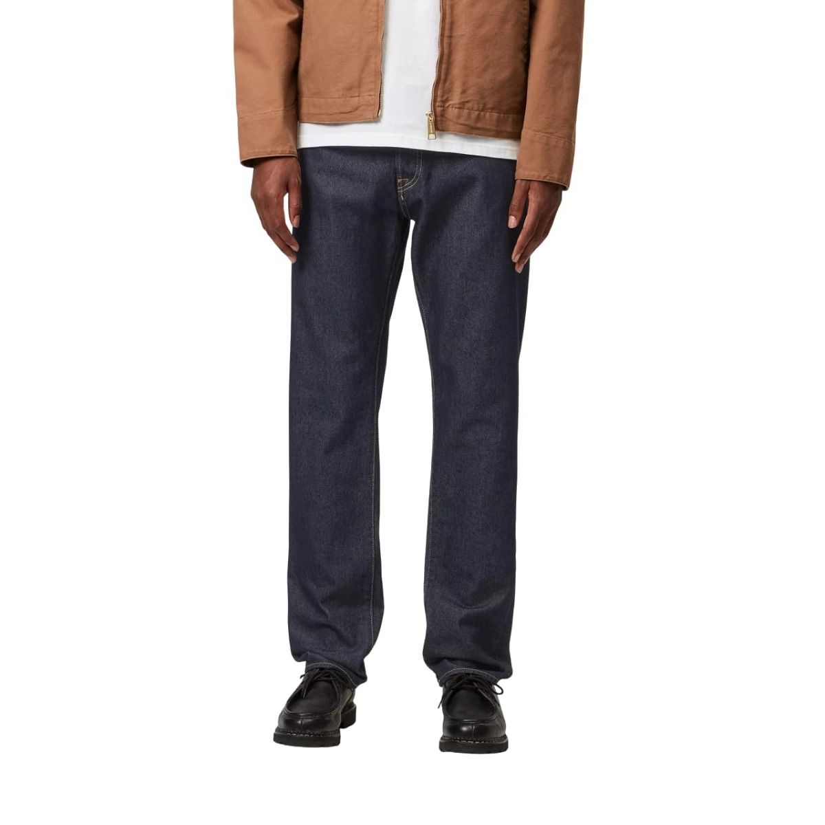 Estos jeans para hombre presentan un ajuste regular ajustado y tiro bajo, adaptándose con naturalidad a la silueta sin sacrificar comodidad. El lavado One Wash suaviza ligeramente el tejido, conservando el carácter del denim azul crudo. Incluyen bragueta con botones metálicos, costuras reforzadas y el icónico parche cuadrado Carhartt WIP cosido en el bolsillo trasero derecho.