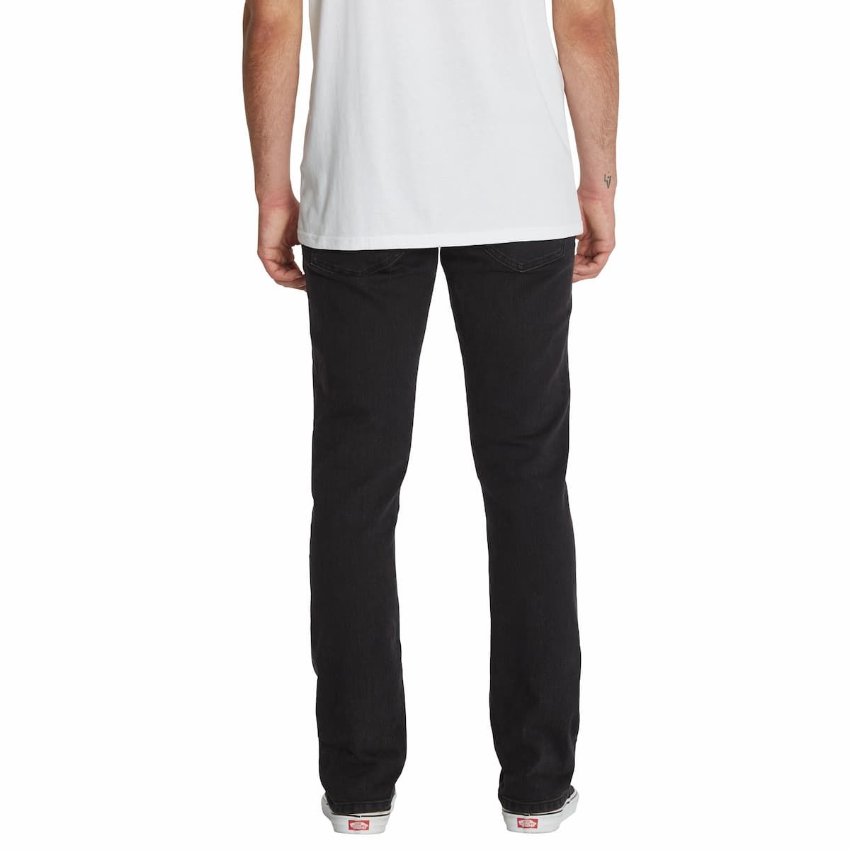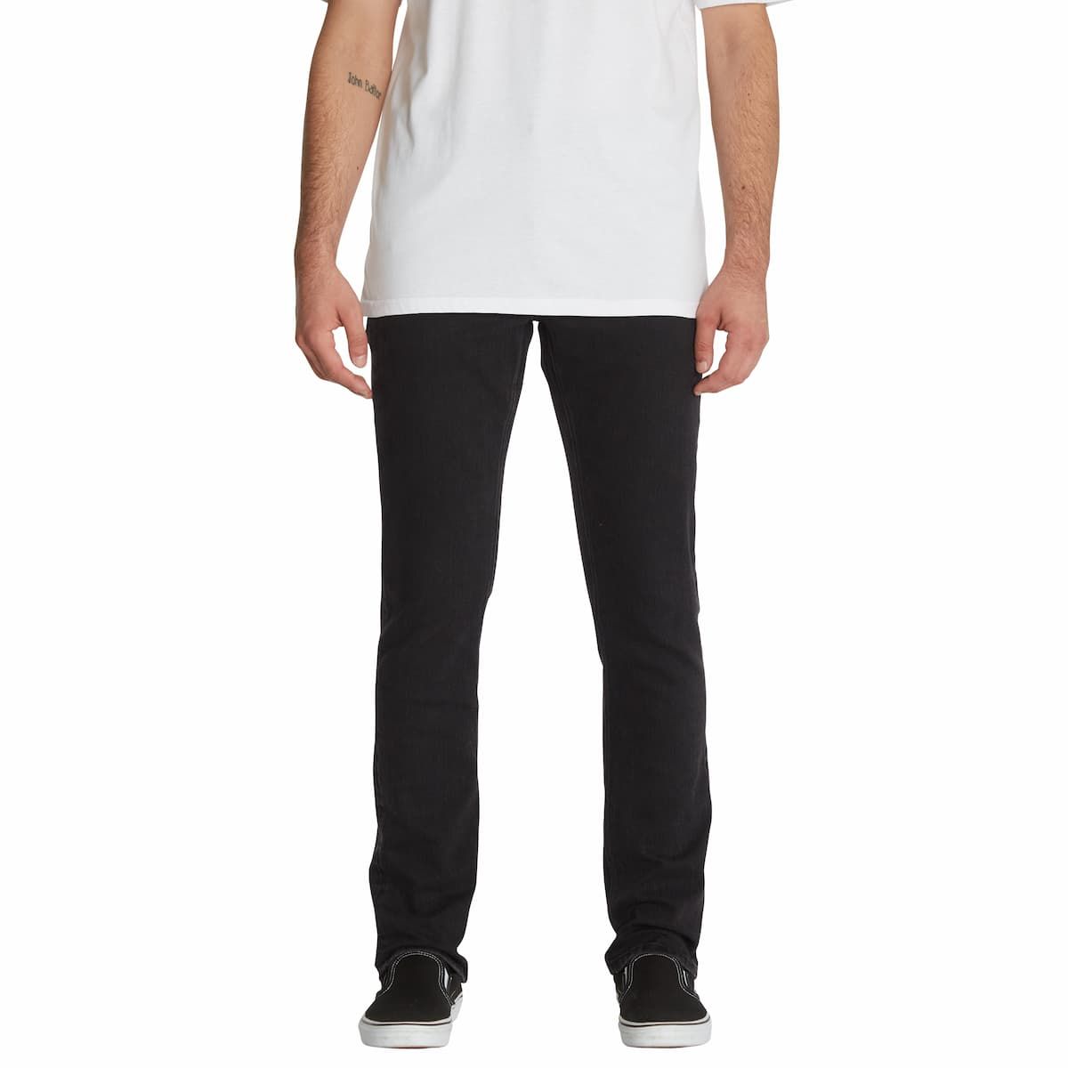 Estos vaqueros para hombre de corte slim y tiro normal, cuentan con pernera recta con una abertura de 38cm (15"), tejido vaquero elástico negro con lavado enzimático completo, junto con los detalles característicos de Volcom Brand Jeans.