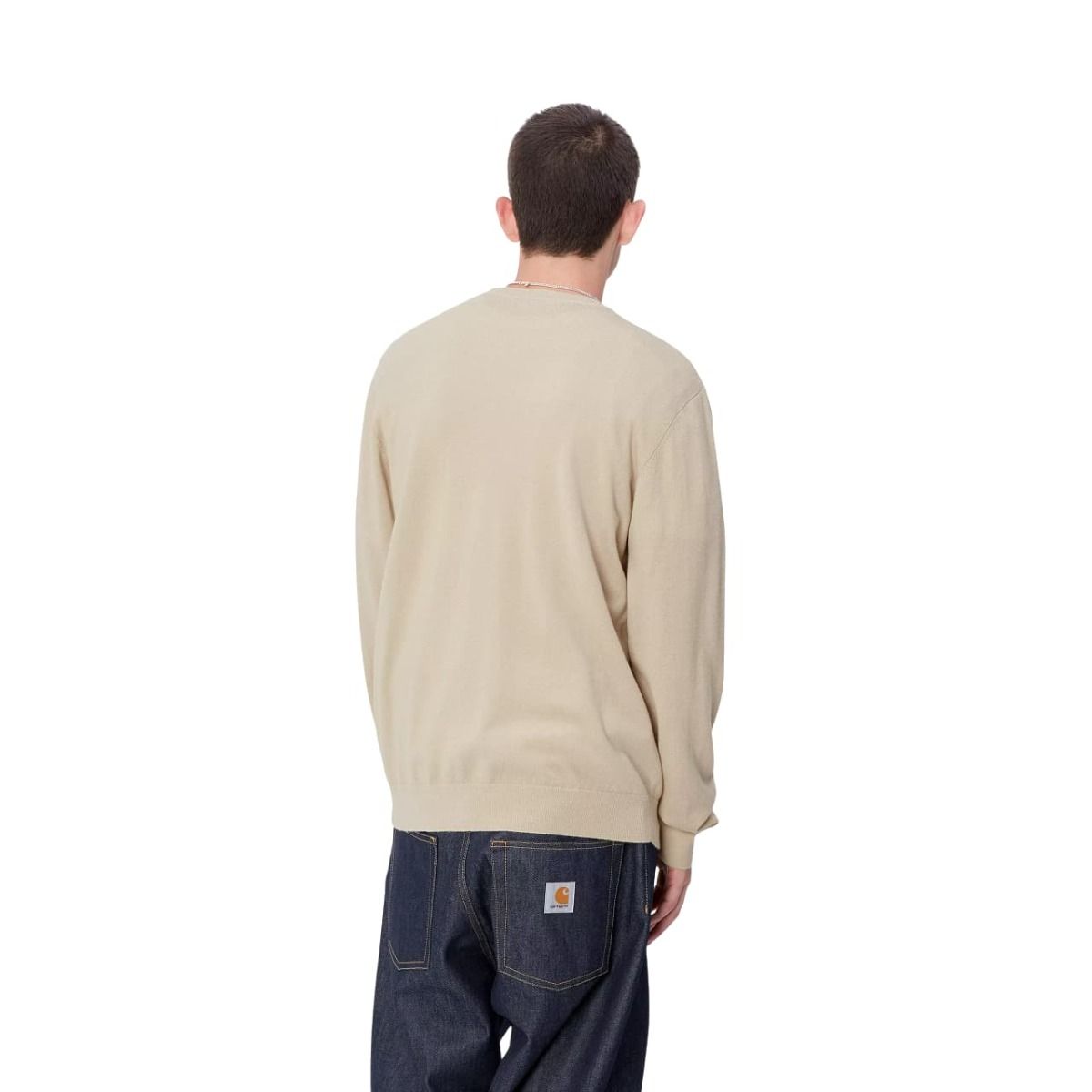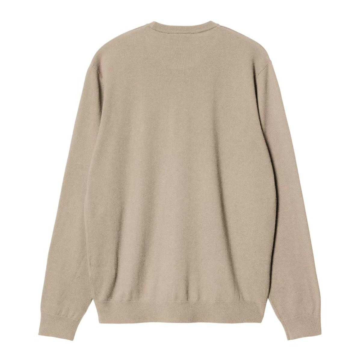 Este cálido suéter de lana color beige de corte clásico cuenta con cuello redondo, punto canalé en el cuello, el dobladillo y los puños, junto con el logo de la "C" de Carhartt bordado en tono negro en el lado izquierdo del pecho.