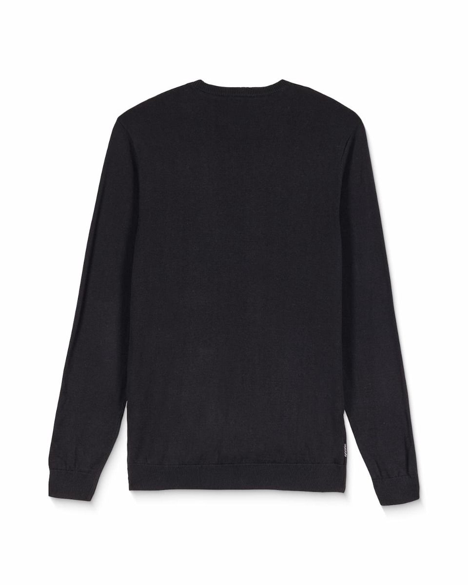Este suéter color negro de grosor medio cuenta con corte ajustado, cuello redondo, punto canalé en puños y dobladillo, tejido jaspeado y el logo Stone bordado en el lado izquierdo del pecho.