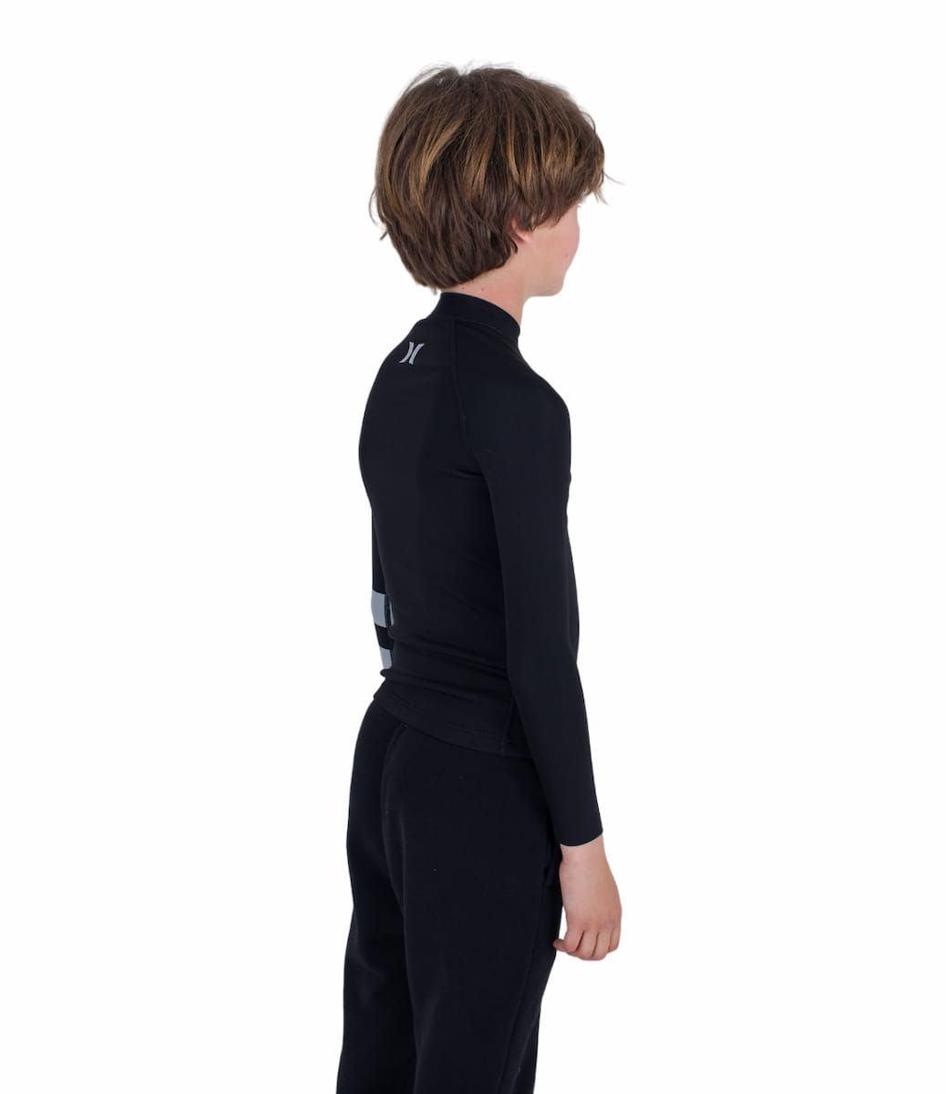 Esta chaqueta para surf juvenil color negro cuenta con cuello redondo, manga larga, costuras anatómicas para que la tela se mueva de forma natural, costuras flatlock que no rozan la piel, acabado limpio en los puños para un mejor ajuste y evitar la entrada de agua, las icónicas rayas Block Party impresas en gris en la manga izquierda y el logo Icon de Hurley serigrafiado en el lado izquierdo del pecho y en la espalda.