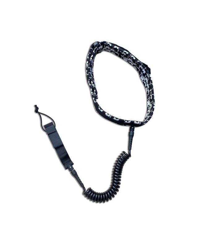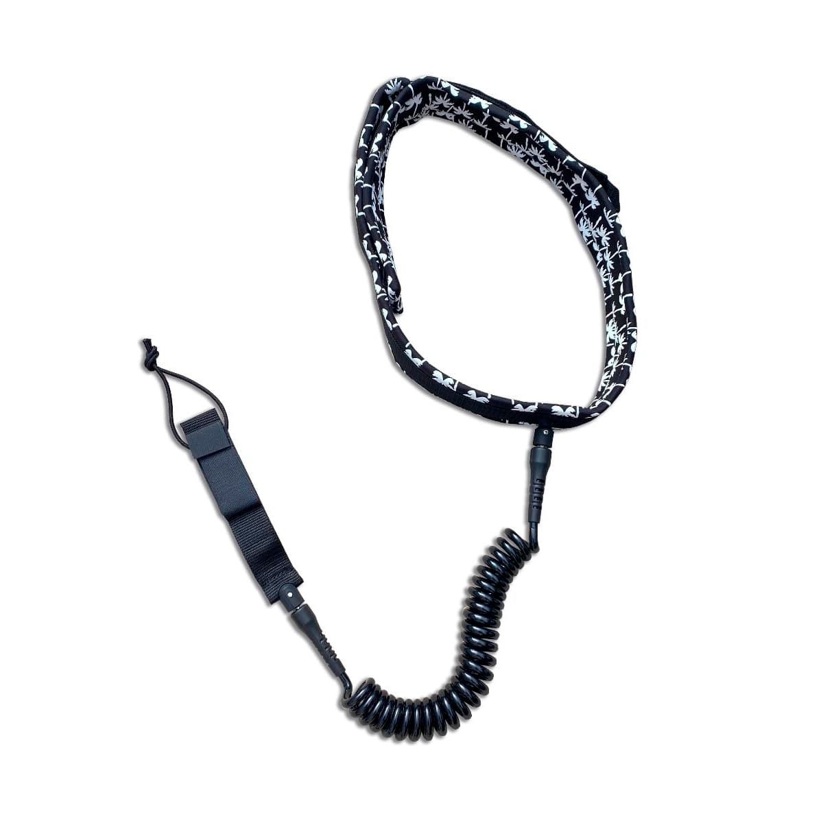 El leash para atar a la cintura Coil Waist 7' 7mm en negro con detalles tropicales en blanco (Black-White) de Radz Hawaii está especialmente diseñado para Wing, Foil o Race SUP.