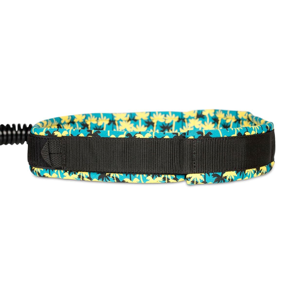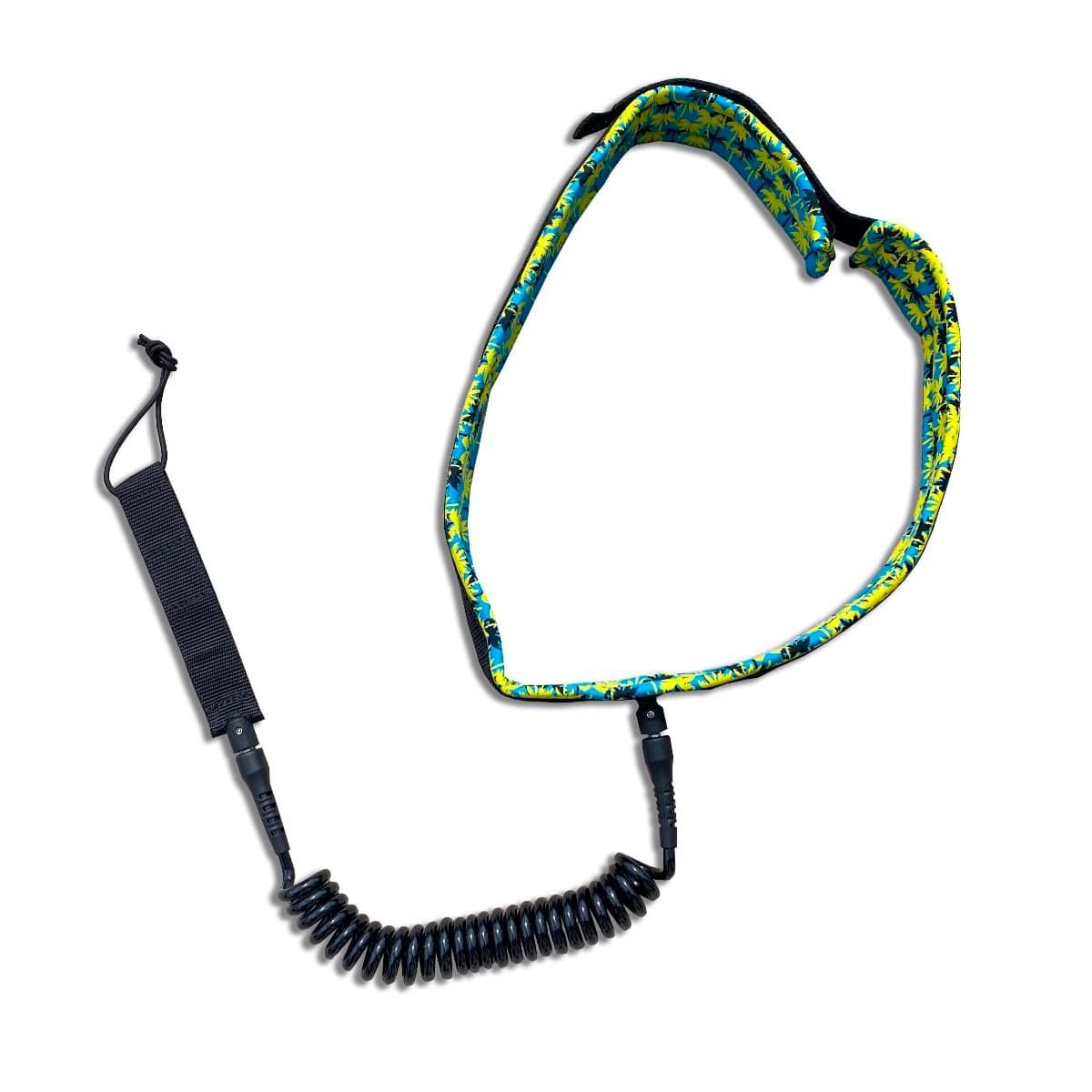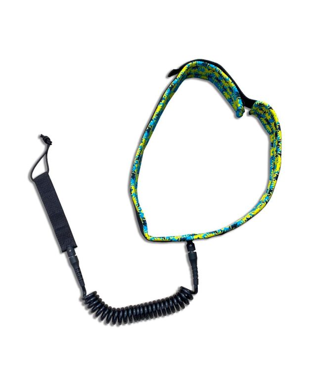 El leash para atar a la cintura Coil Waist 7' 7mm en azul con detalles tropicales en amarillo (Blue-Yellow) de Radz Hawaii está especialmente diseñado para Wing, Foil o Race SUP.