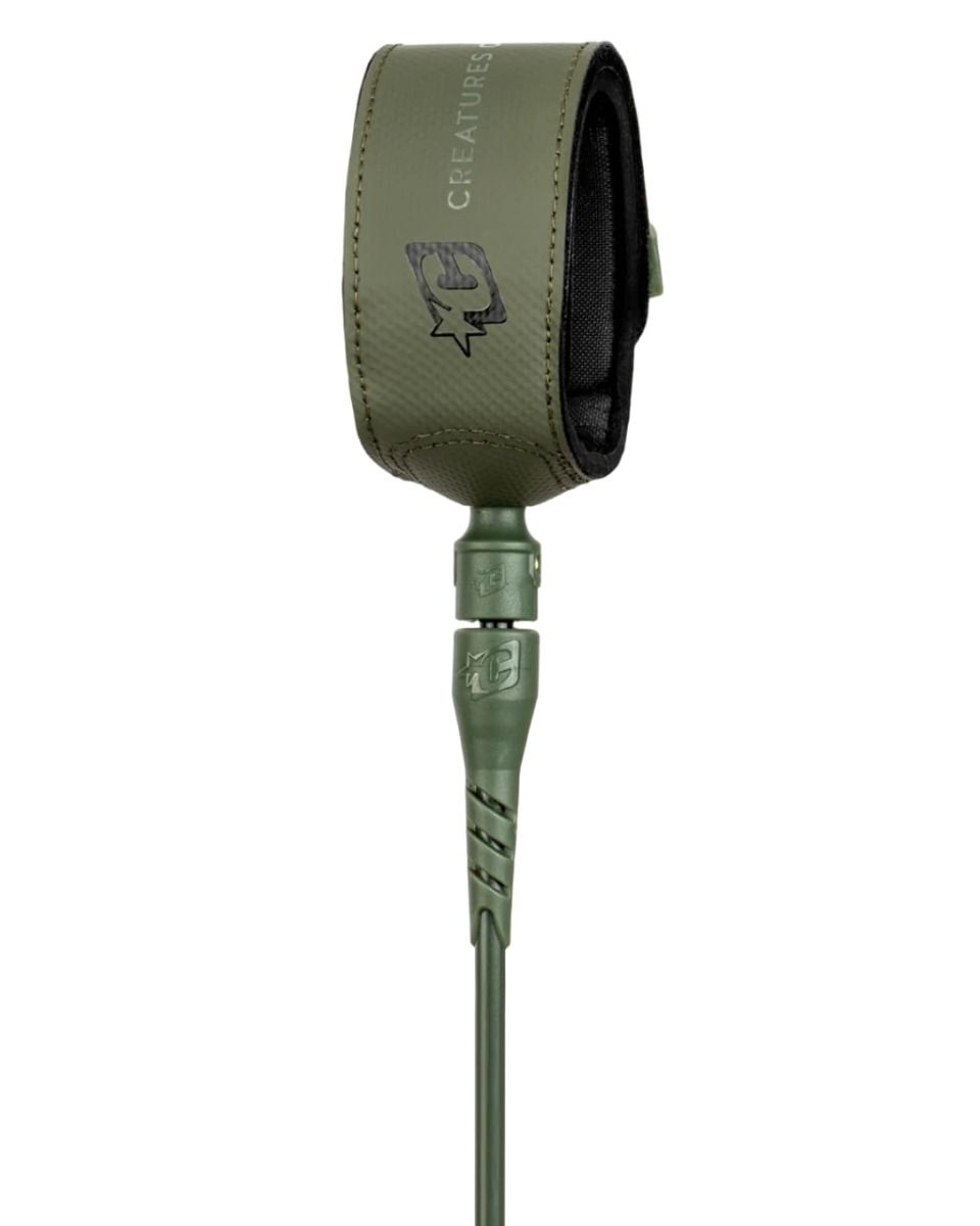 El leash para tabla de surf Creatures Superlite Pro 6', recomendado para olas medianas, está disponible en color negro con plateado (Black-Silver), transparente con moteado en negro (White Speckle Black), Gris (Midnight) y verde militar (Military).