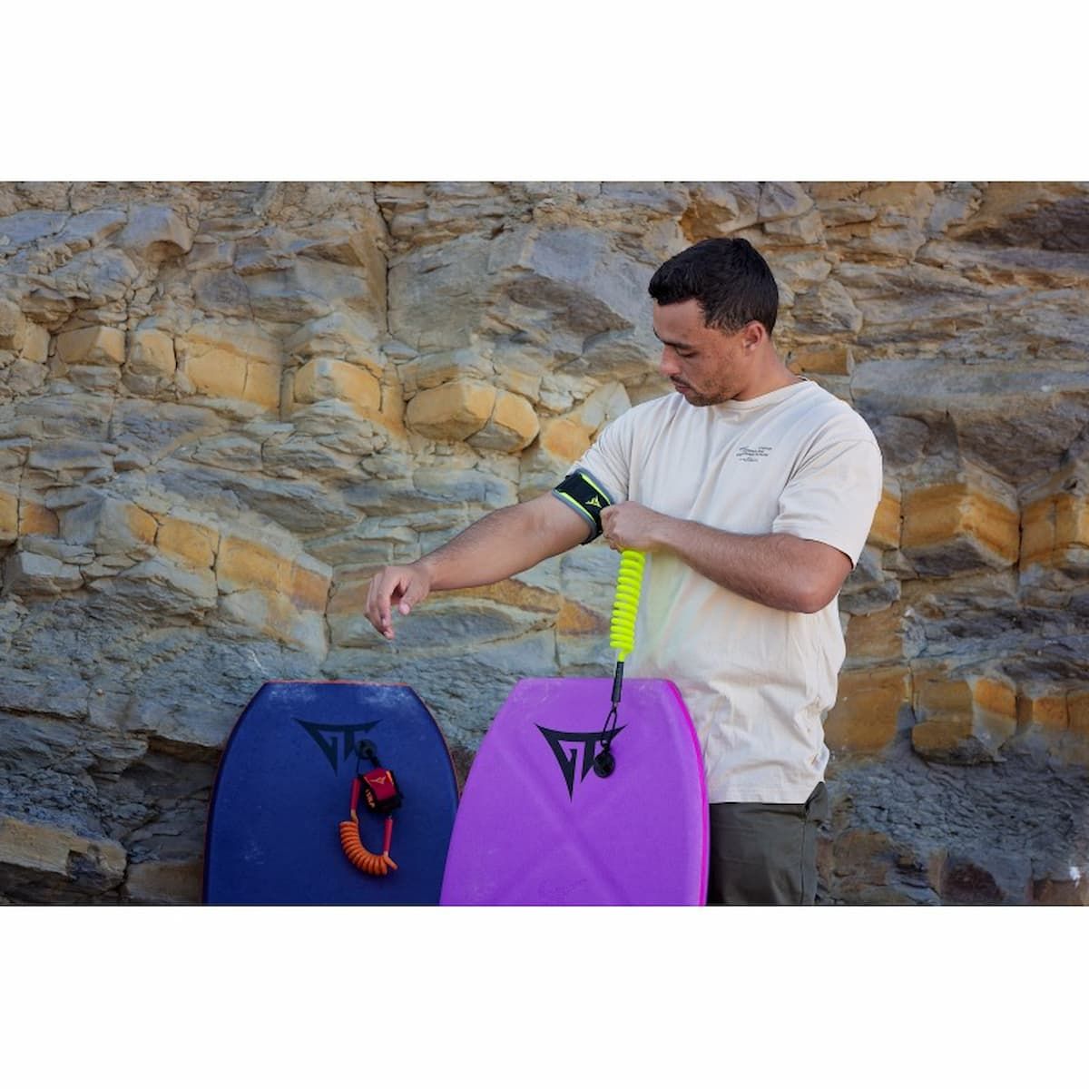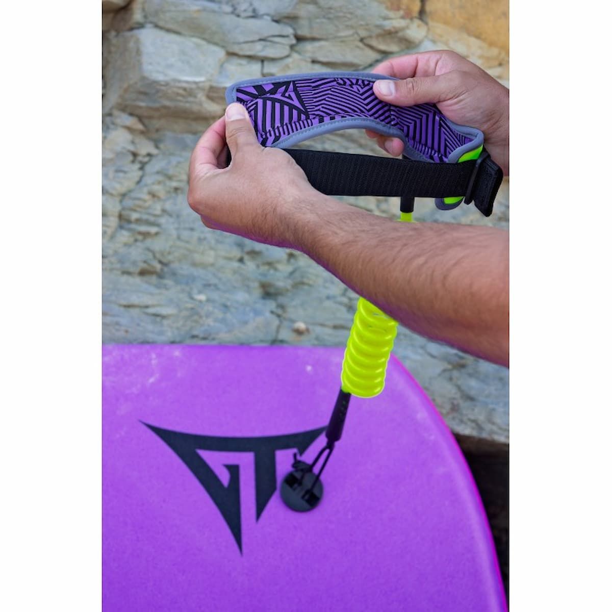 Potencia tu rendimiento en el agua con el Invento para Bodyboard GT Biceps Leash 9mm en tono amarillo flúor y gris (Fluo yellow Grey) de GT Boards, diseñado para ofrecer máxima resistencia, comodidad y libertad de movimiento. Su tecnología de doble giravueltas evita enredos, mientras que el cordón de PU de 9 mm de calidad premium soporta las olas más exigentes.