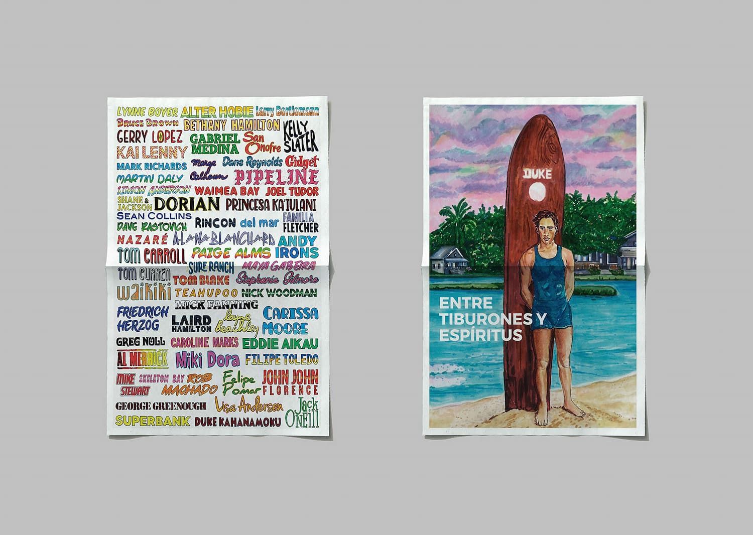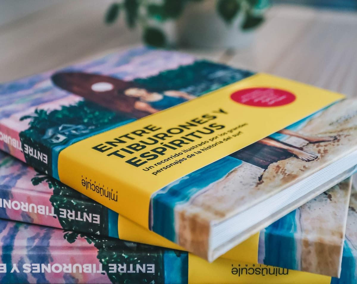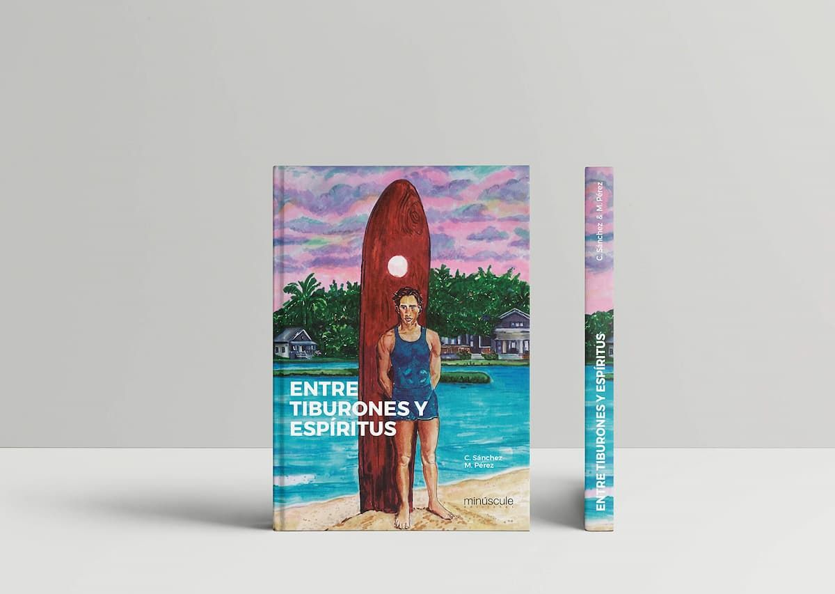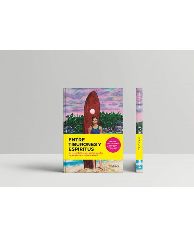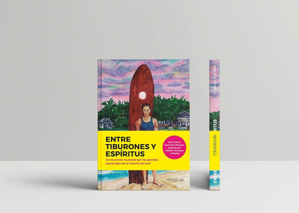 Este trabajo de María Pérez (ilustración) y Carlos Sánchez (textos): "Entre tiburones y espíritus" realiza un recorrido ilustrado por los grandes personajes de la historia del surf: surfistas destacados del circuito masculino y femenino, free surfers que cambiaron el rumbo del surf, inventores de los grandes avances de nuestro deporte y alguno de los mejores spots del mundo.