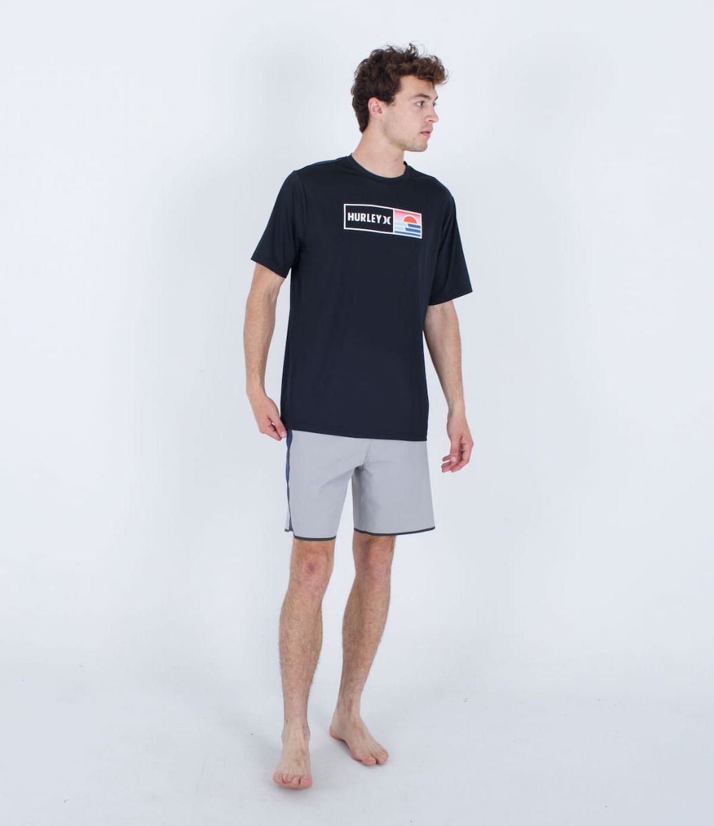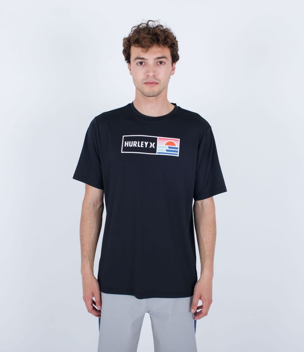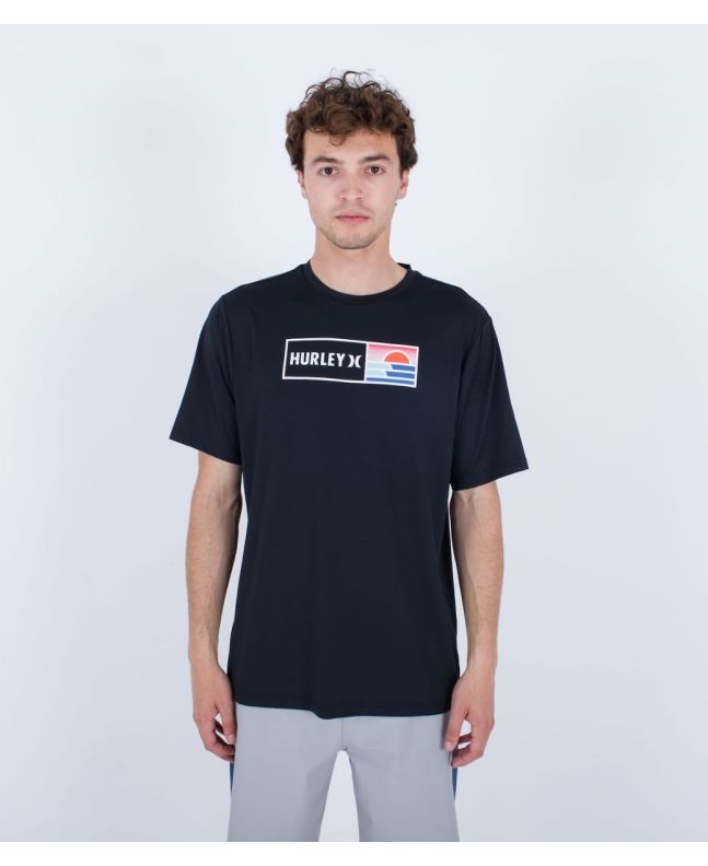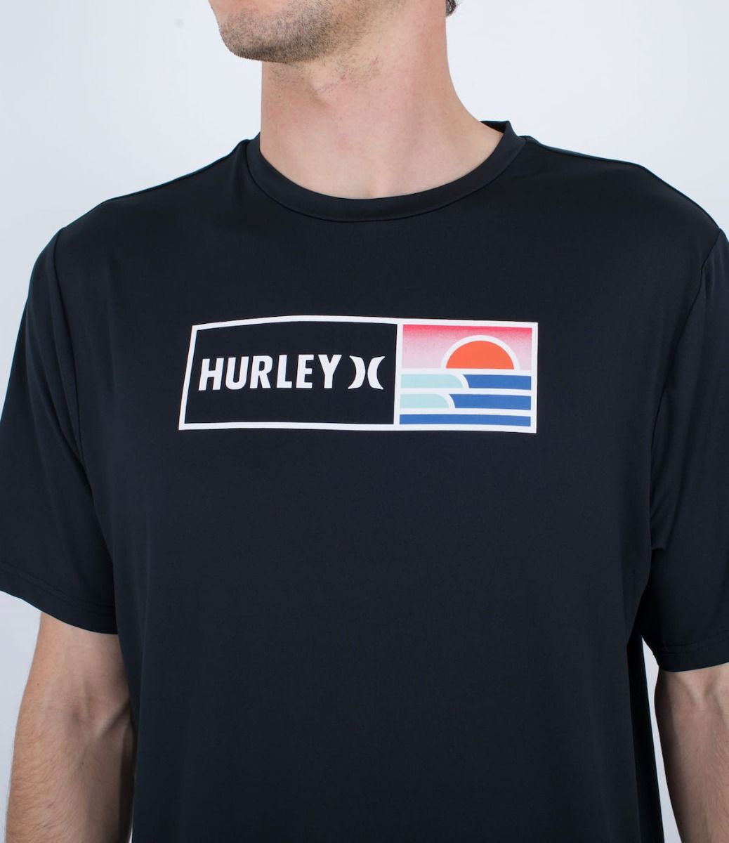 Esta camiseta antiabrasión de ajuste clásico en tono negro cuenta con manga corta, cuello redondo, tejido híbrido para que puedas utilizarla tanto dentro como fuera del agua, protección solar UPF 50+, junto con un gráfico Hurley serigrafiado en el pecho.