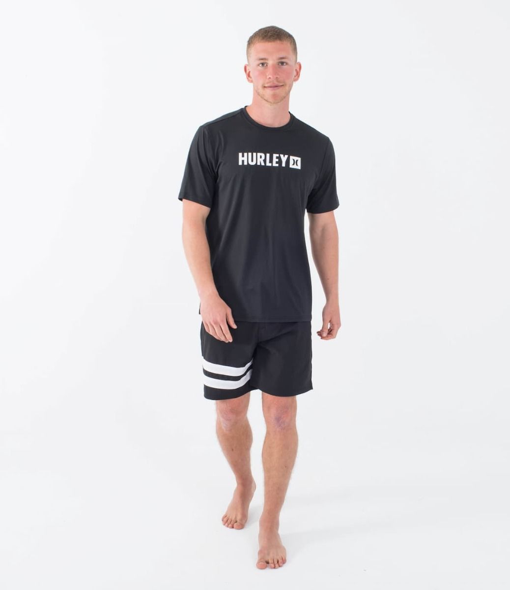 Esta camiseta antiabrasión negra de ajuste clásico cuenta con manga corta, cuello redondo, tejido híbrido para que puedas utilizarla tanto dentro como fuera del agua, protección solar UPF 50+, junto con el logo de Hurley serigrafiado en color blanco en el pecho.