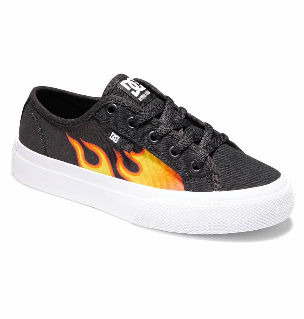 Las zapatillas para chico Manual en negro con estampado en llamas (Black-Flames) de DC Shoes están confeccionadas con textil (algodón) y caucho.