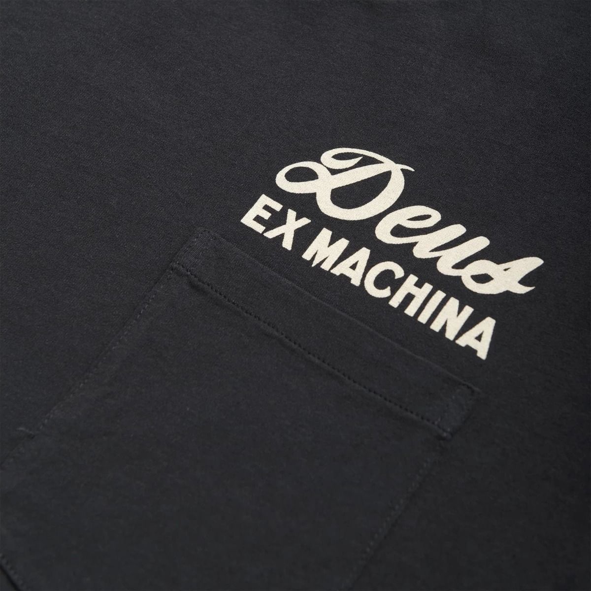 La camiseta de manga corta con bolsillo Milan Address negra tiene una etiqueta con el logo de Deus tejida en la manga izquierda.