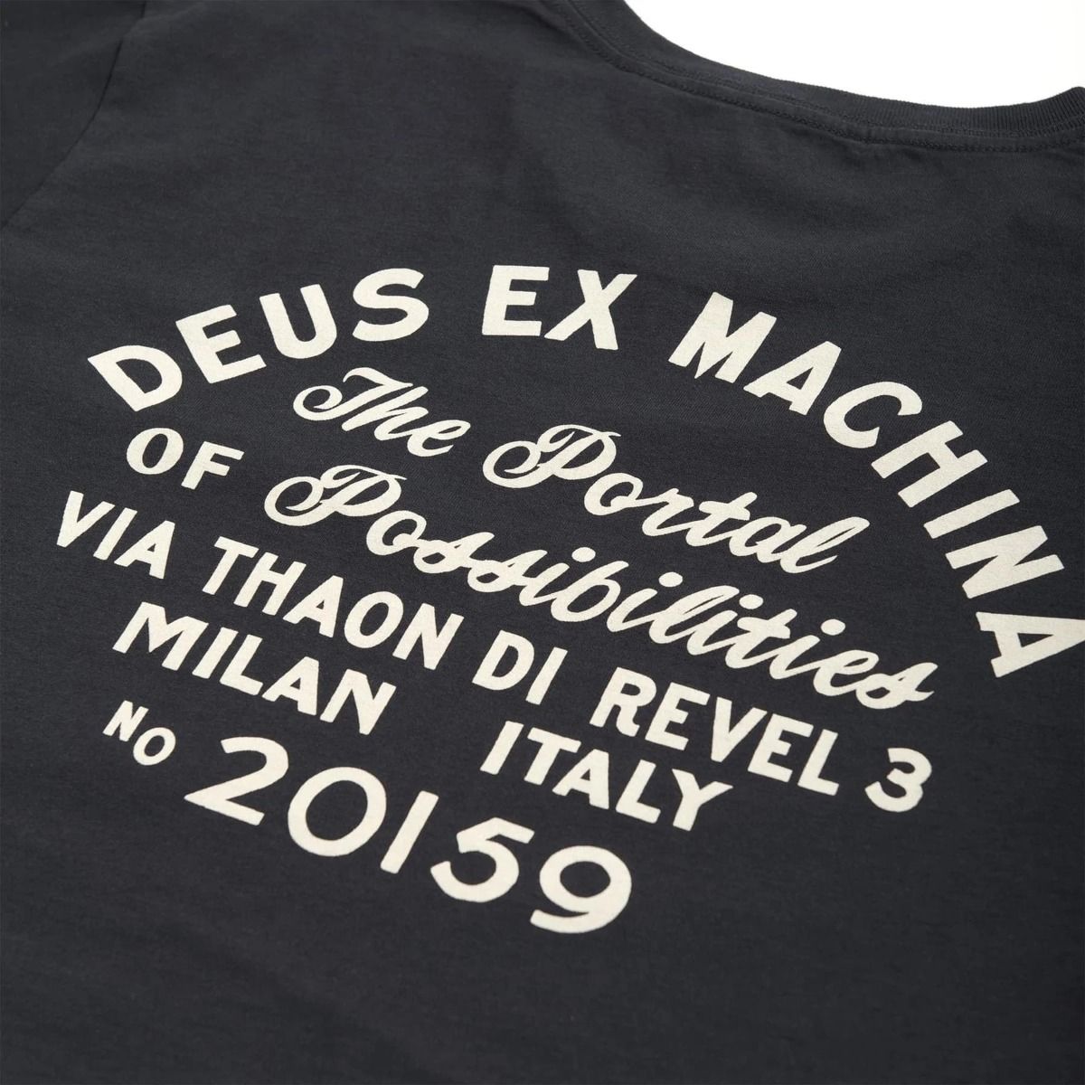 Esta camiseta de ajuste regular cuenta con cuello redondo, manga corta, bolsillo en el pecho, el logo de Deus Ex Machina estampado encima del bolsillo y la dirección de la tienda Deus en Milán serigrafiada en la espalda.