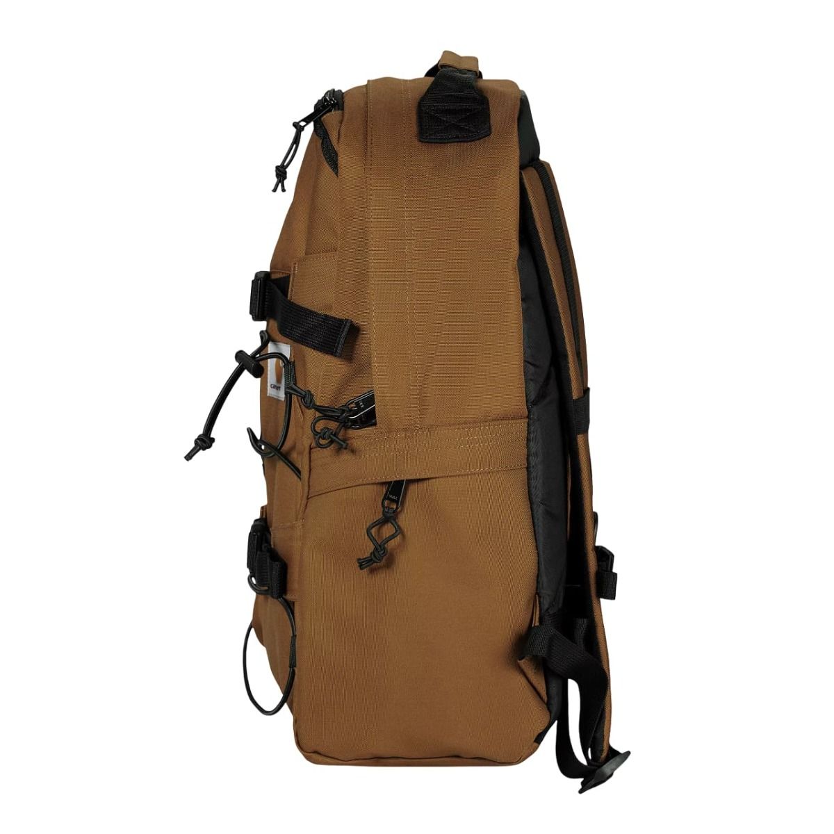 Esta mochila de skateboard marrón sin forro cuenta con lona que repele el agua, un compartimento principal con cierre de cremallera bidireccional, un bolsillo de acceso superior, un bolsillo lateral de malla, un bolsillo lateral con cremallera, espalda acolchada, correas de hombro acolchadas y ajustables, asa superior, correas delanteras para sujetar el monopatín y una etiqueta cuadrada con el logo de Carhartt tejida en la parte delantera y en la correa izquierda.
