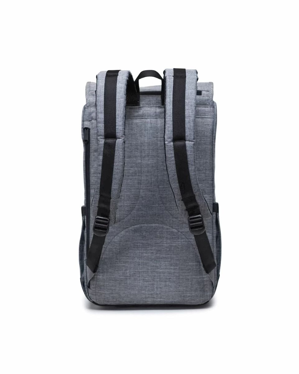 La mochila para hombre y mujer Little America Backpack 30L en tono gris jaspeado (Raven Crosshatch) de Herschel Supply Company está confeccionada con resistente Tejido EcoSystem™ 600D fabricado a partir de botellas de agua postconsumo 100% recicladas.