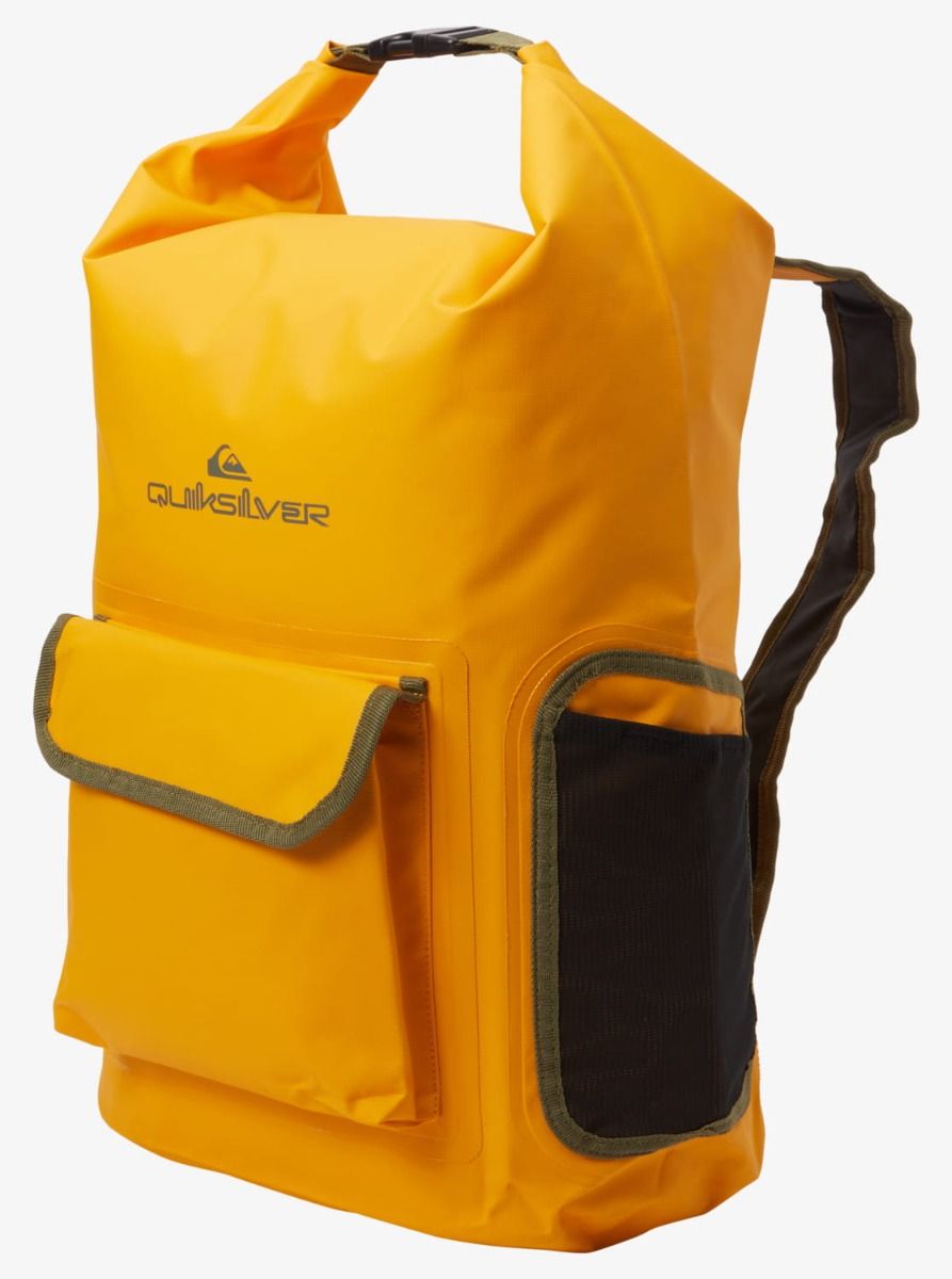 Esta práctica mochila para transportar tu neopreno cuenta con un amplio compartimento principal estanco reforzado para artículos mojados y secos, cierre superior enrollable, costuras reforzadas, soporte lateral para botella de agua con accesorio de anillo en D, bolsillo frontal, bolsillos laterales, correas acolchadas ajustables para los hombros, asa superior con cierre de click y los logos de Quiksilver estampados en contraste.