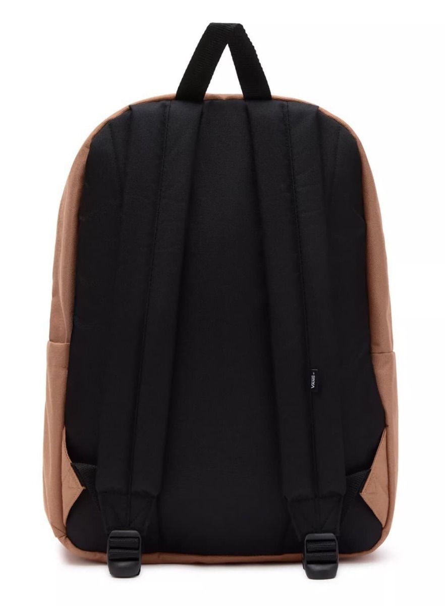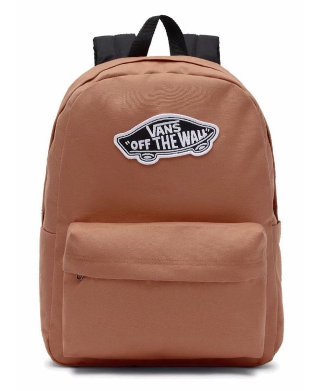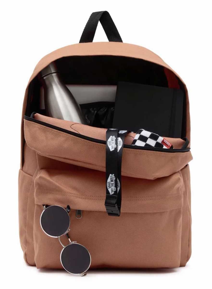 Esta mochila escolar de estilo clásico en color naranja cornalina cuenta con un compartimento principal grande con cierre de cremallera, una funda interior para portátiles de hasta 15 pulgadas, un bolsillo frontal con compartimento organizador, interior con el emblemático estampado checkerboard, un bolsillo lateral para la botella de agua, asa superior, correas de hombro ajustables y acolchadas de corte recto, el emblemático parche con el logotipo del skate «Off The Wall» tejido en el frontal y una etiqueta de Vans® cosida en la correa izquierda.