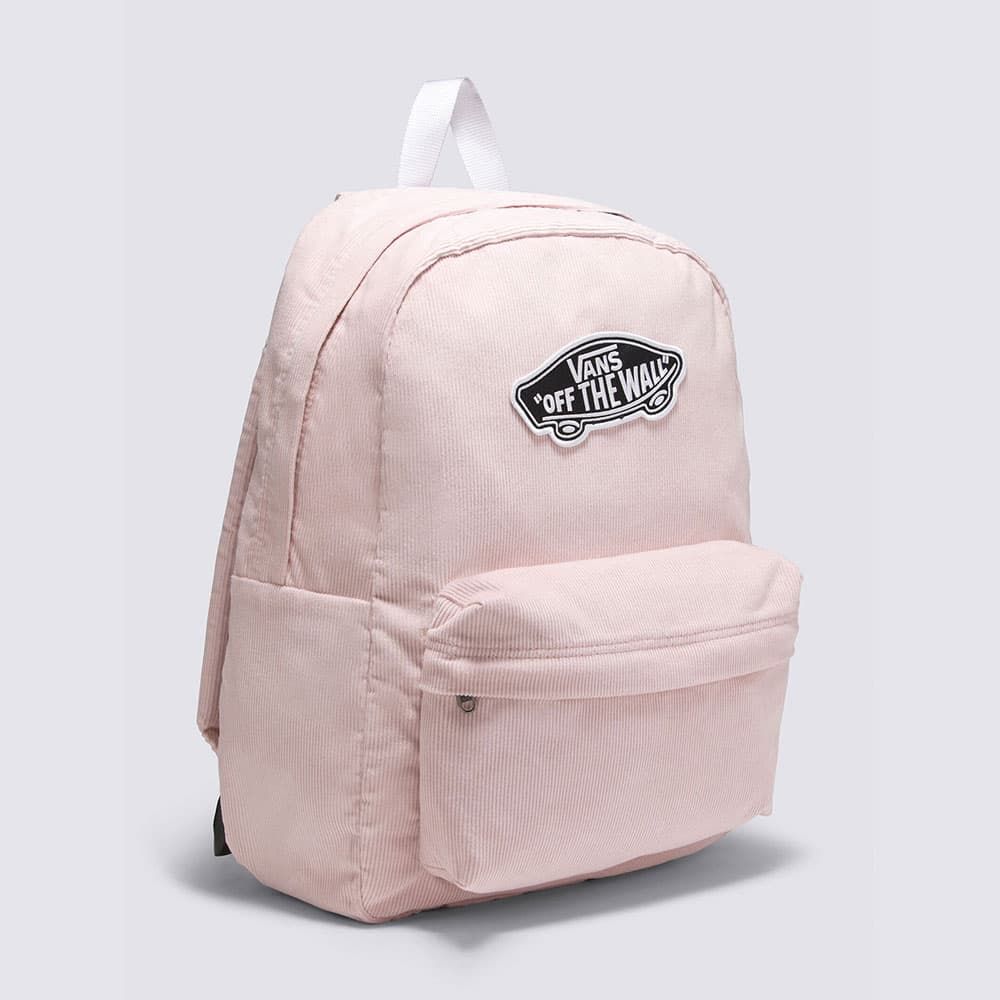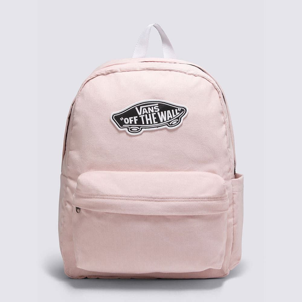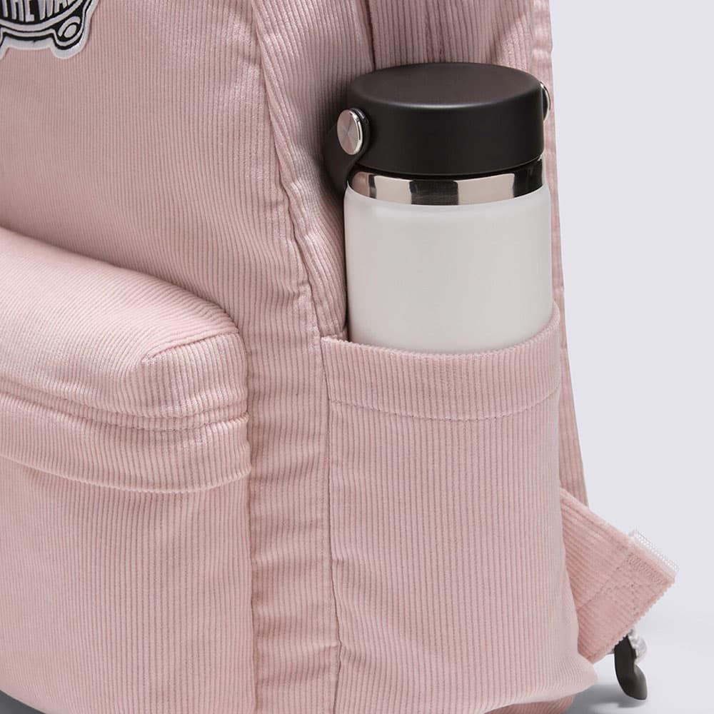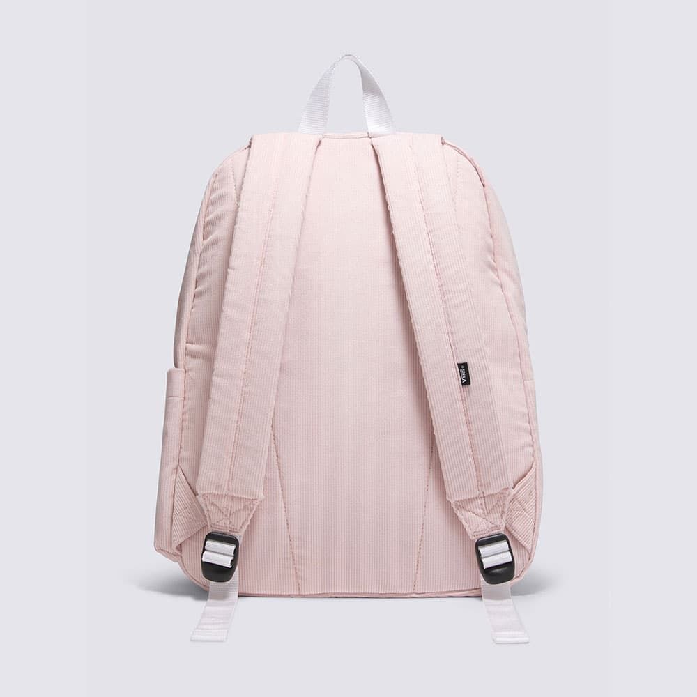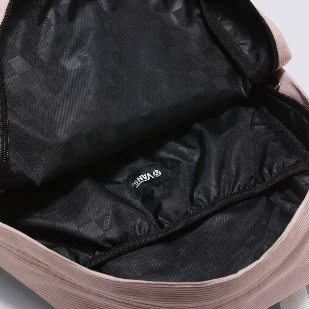 Esta mochila escolar de estilo clásico en un suave color rosa sepia cuenta con un compartimento principal grande con cierre de cremallera, una funda interior para portátiles de hasta 15 pulgadas, un bolsillo frontal con compartimento organizador, interior con el emblemático estampado checkerboard, un bolsillo lateral para la botella de agua, asa superior, correas de hombro ajustables y acolchadas de corte recto, el emblemático parche con el logotipo del skate «Off The Wall» tejido en el frontal, el logotipo Checkerboard Globe y una etiqueta de Vans® cosida en la correa izquierda.