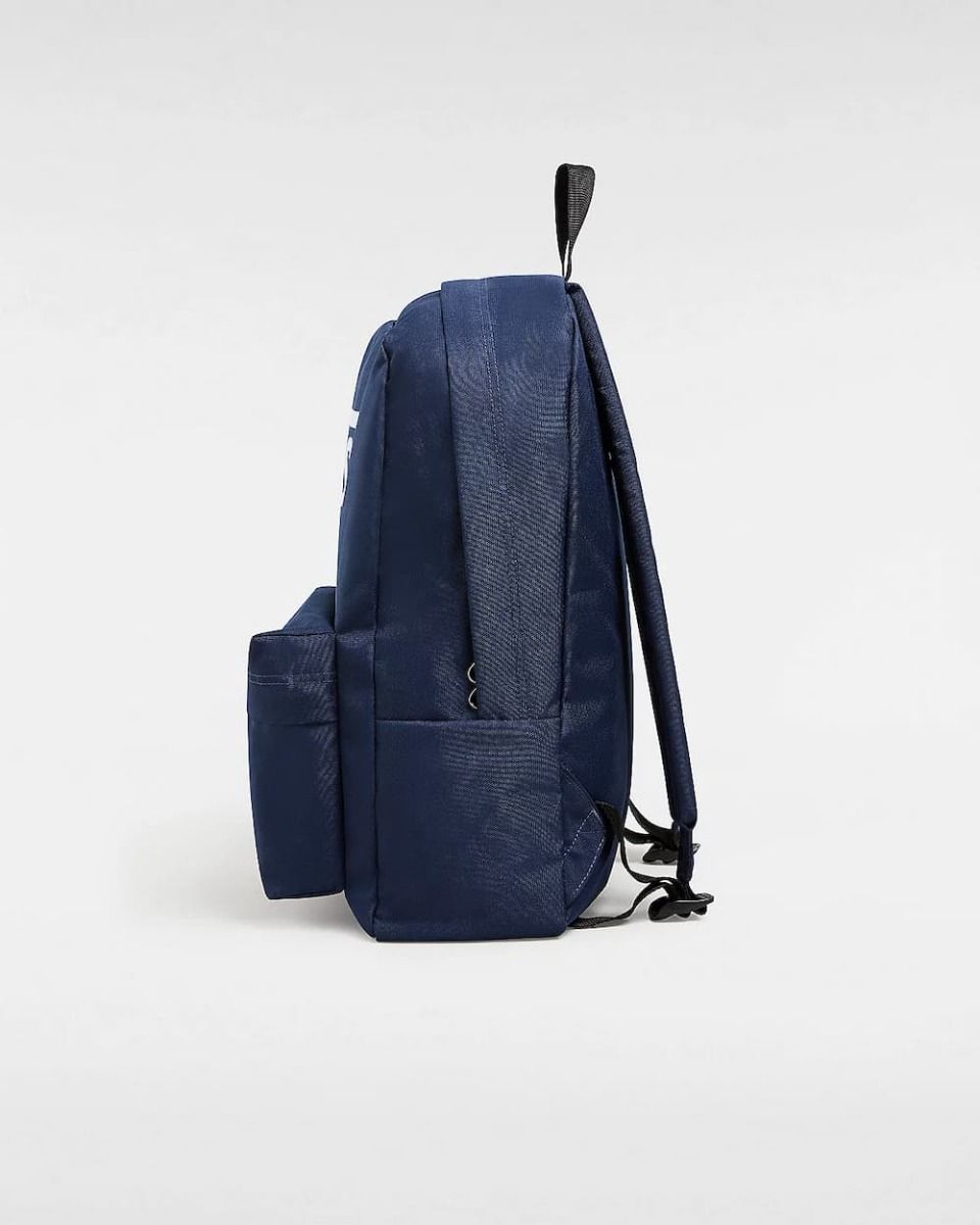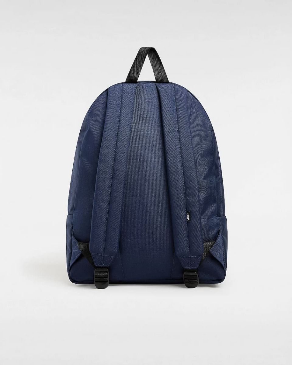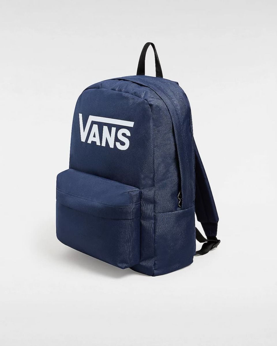 Esta mochila azul marino (Dress Blues) tipo escolar de estilo clásico cuenta con un compartimento principal grande con cremallera, un bolsillo delantero con compartimento organizador, asa superior, correas de hombro ajustables y acolchadas de corte recto y el logo de "Vans" impreso en color blanco en la parte delantera.