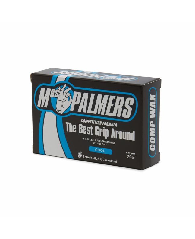 La parafina para aguas templadas de entre 13 y 18ºC Mrs Palmers Comp Cool Water Surf Wax está disponible en tacos de 70 gramos.