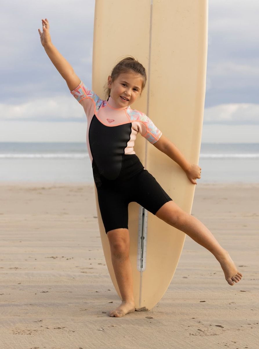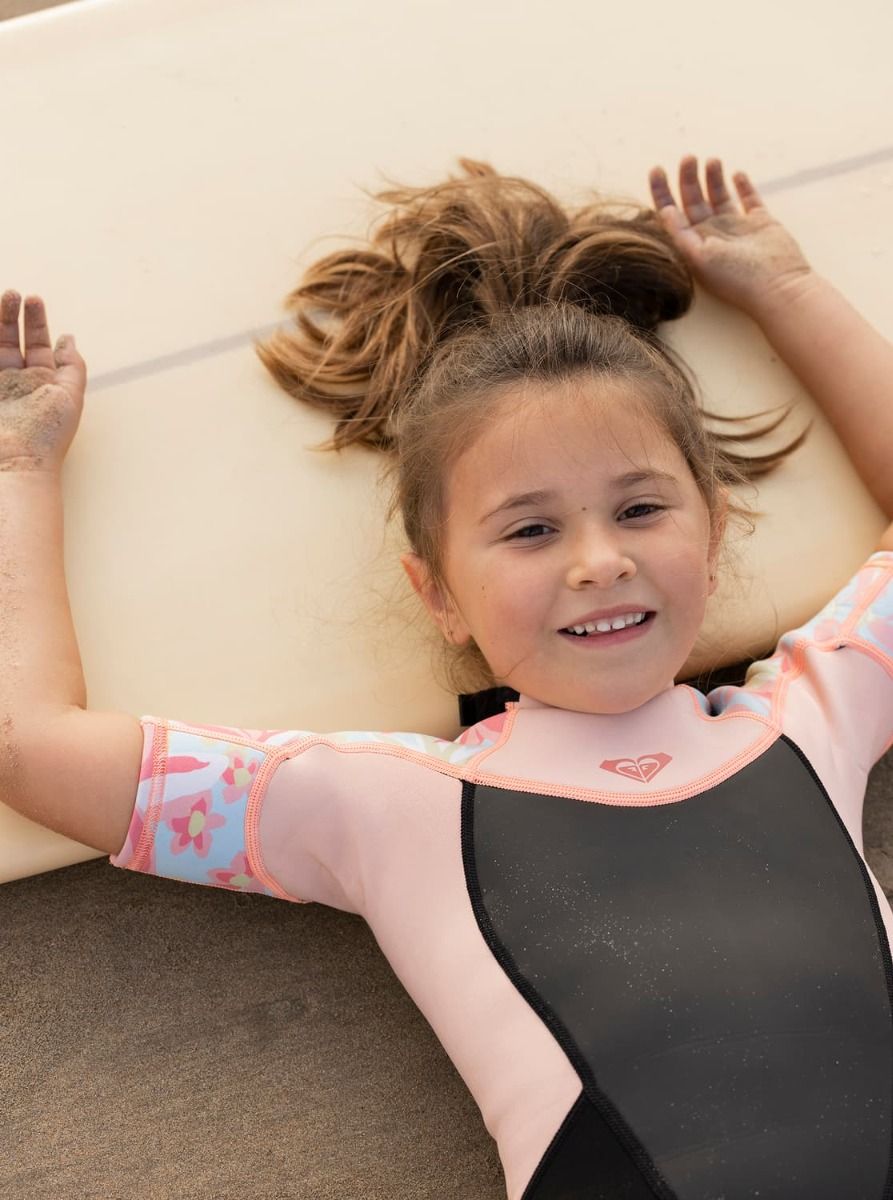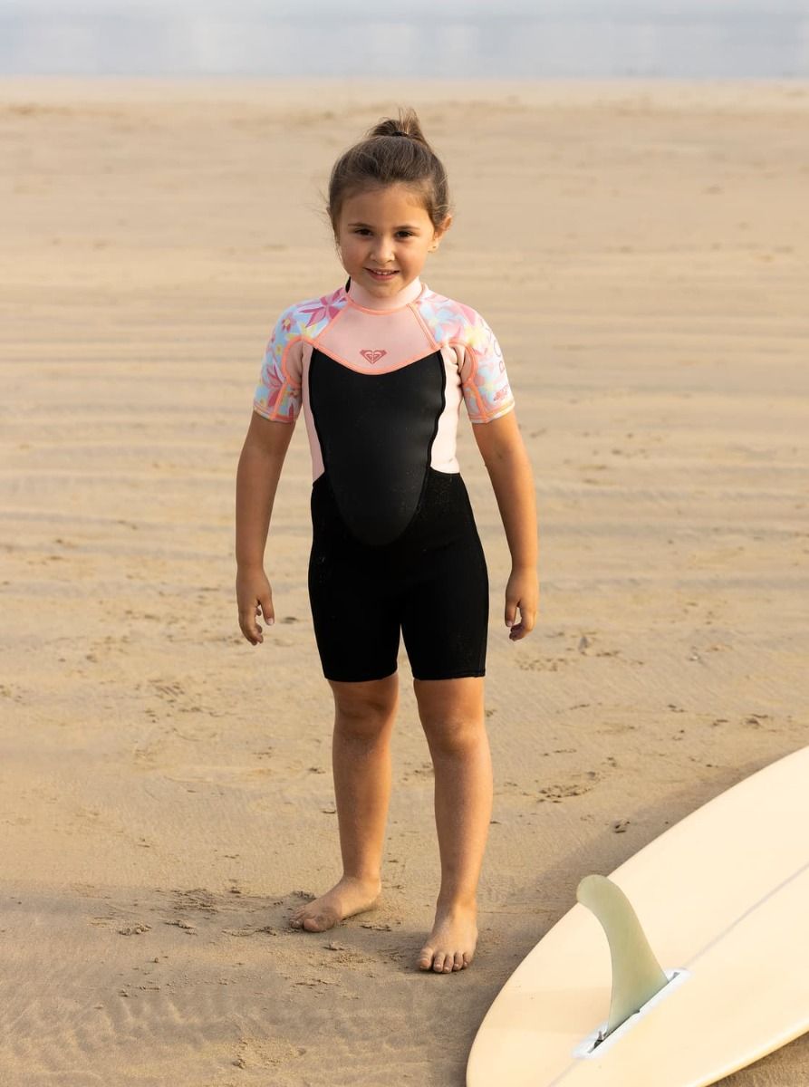 Traje de Surf de primavera con manga corta y cremallera en la espalda Roxy Girl Prologue Tiny 2/2mm en color rosa floral para niña (2-7 años)
