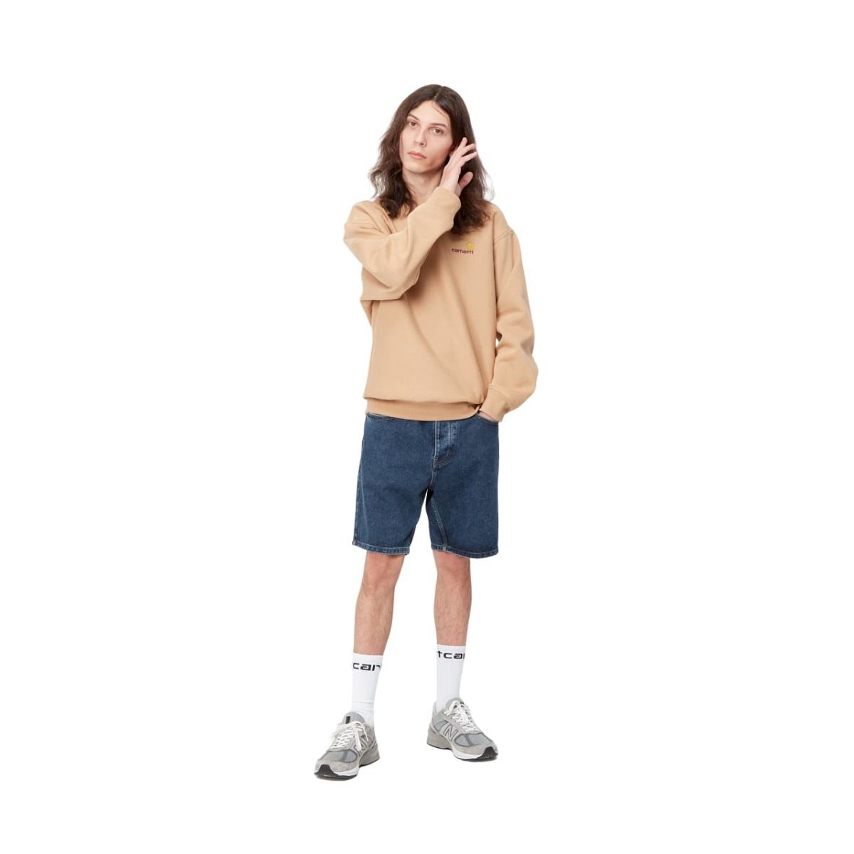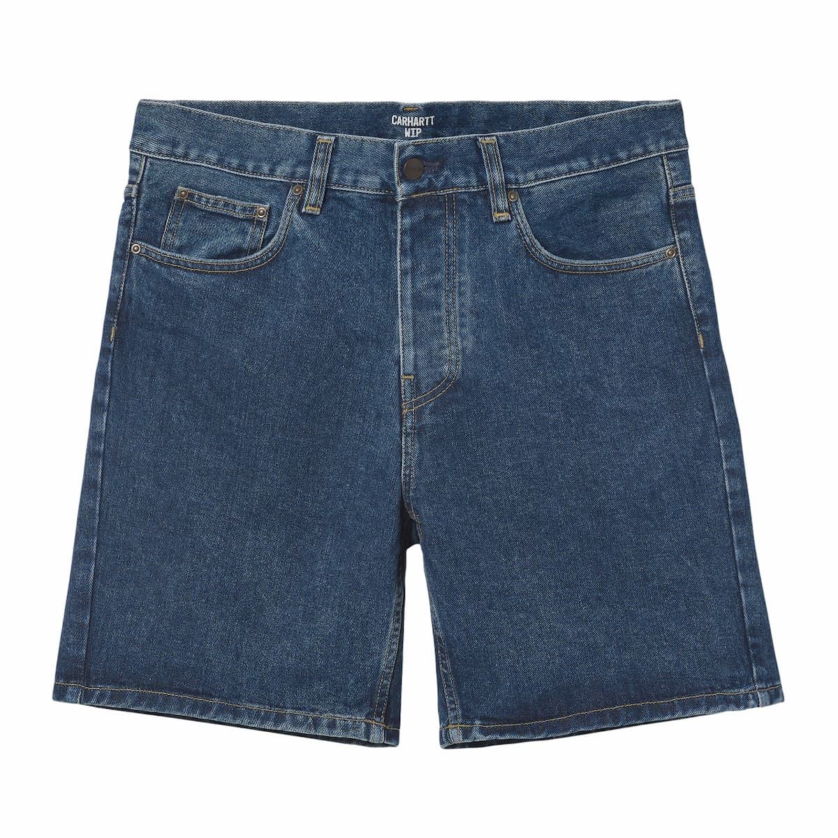 Este short vaquero viene con denim lavado a la piedra para un tacto más suave y mayor comodidad, ajuste relajado y talle regular para un look casual y desenfadado, bragueta con cierre de botones, costuras reforzadas y/o remaches metálicos en las zonas de más tensión, bolsillos delanteros y traseros, canesú trasero, junto con una etiqueta cuadrada con el logo de Carhartt cosida en el bolsillo posterior derecho.