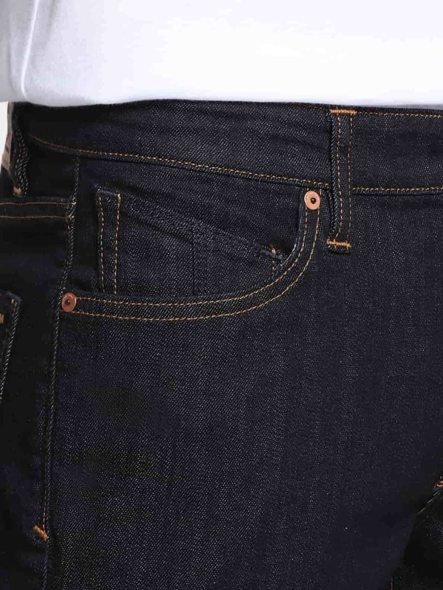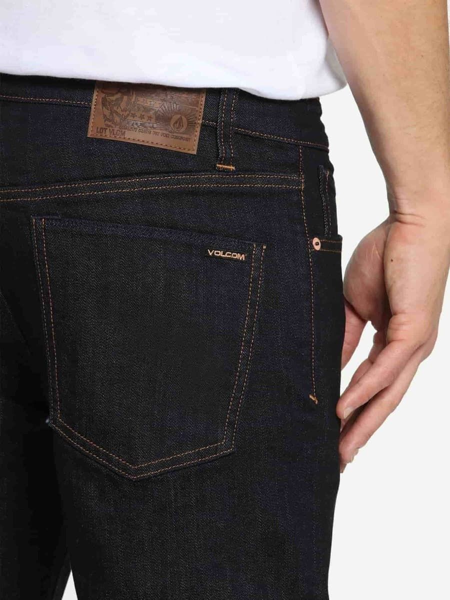 Los jeans 2X4 Denim en color azul marino Rinse tienen una etiqueta de garantía Volcom en la cintura interior.