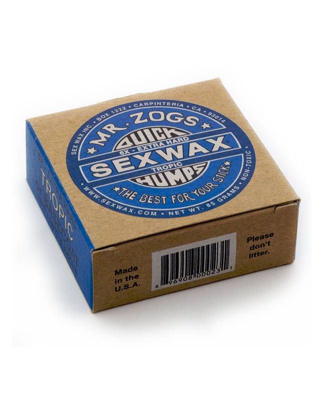 La relación entre el color de la etiqueta de las parafinas Sex Wax Quick Humps y cada fórmula de sus ceras sigue siendo la misma: el color azul de esta cera para tablas de surf indica que es apropiada para aguas tropicales de más de 26º.