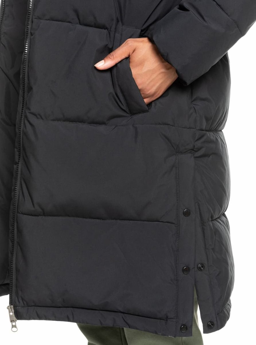 Esta parka acolchada e impermeable para mujer cuenta con corte largo, forro repelente al agua, acolchado grueso para mayor calidez, capucha acolchada y ajustable mediante cordón elástico, cierre frontal de cremallera completa, aberturas laterales con corchetes, cuello alto, dos bolsillos laterales con cierre de botón a presión y un parche de silicona ROXY tejido en las mangas.