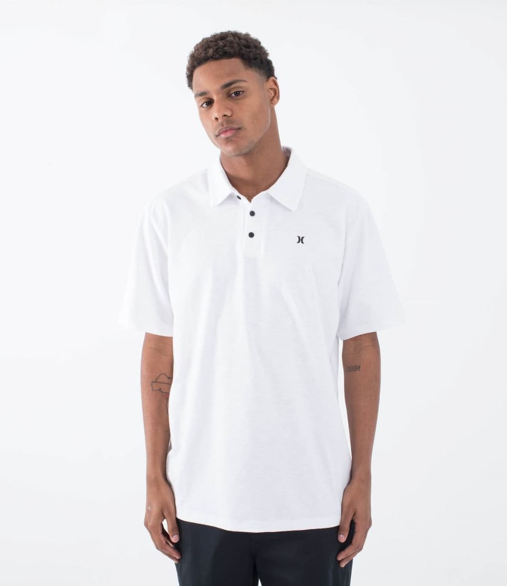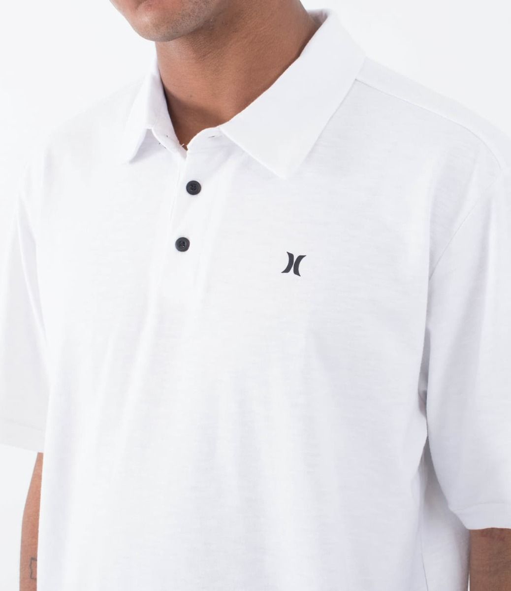 Ya disponible en Mission Surf Shop, el polo de manga corta Icon Slub blanco para hombre de Hurley es ideal para un look versátil y moderno.