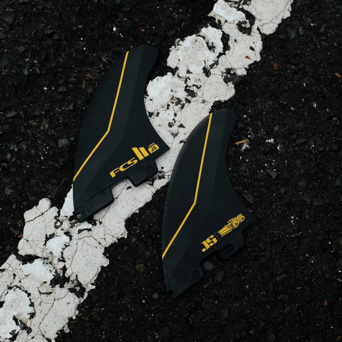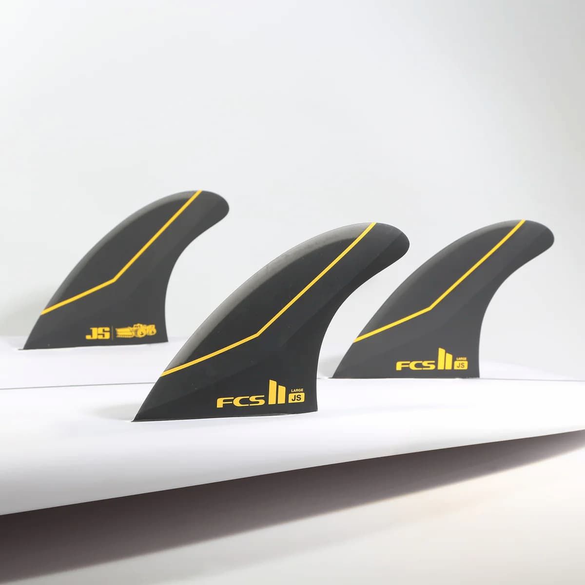 Las quillas para tabla de surf FCS II JS PC Carbon Tri-Fins en talla L y color negro tienen el logo de FCS y JS Industries estampado.