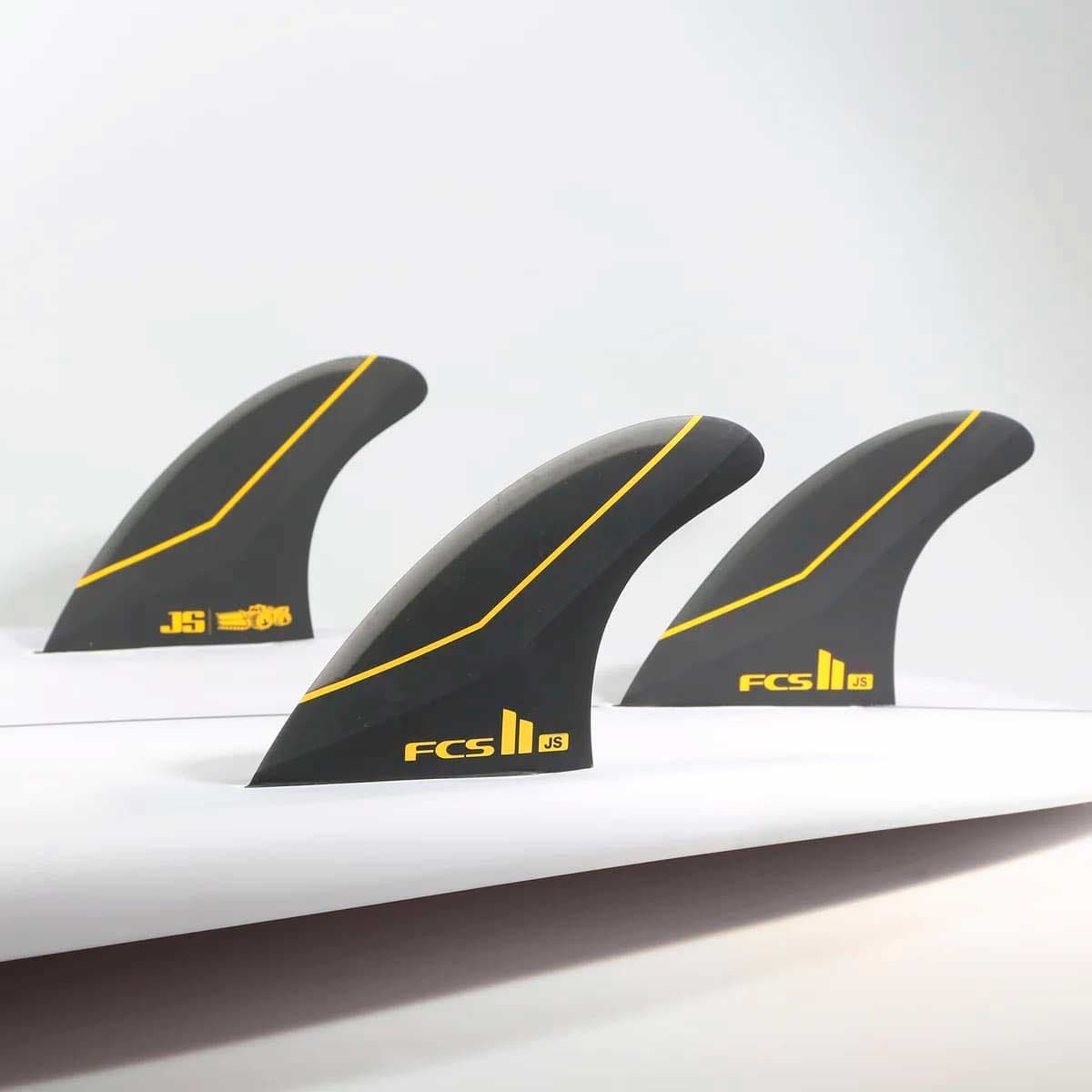Las quillas para tabla de surf FCS II JS PC Carbon Tri-Fins en talla M y color negro tienen el logo de FCS y JS Industries estampado.