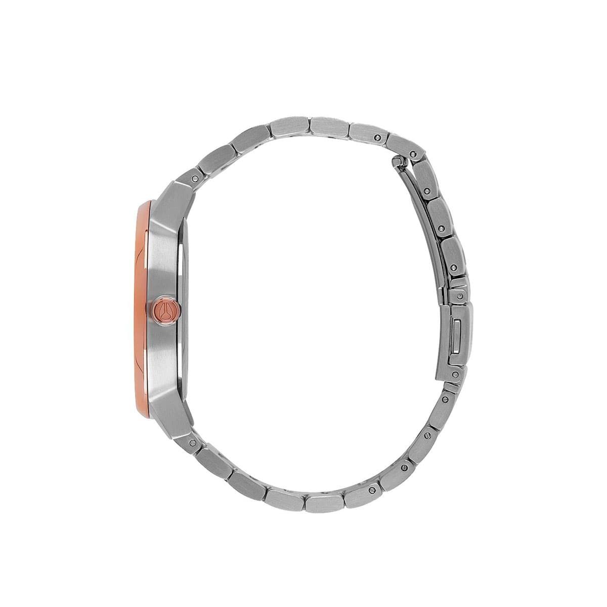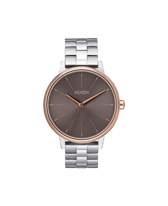 El reloj analógico sumergible Nixon Kensington en tono plateado, rosa dorado y marrón (Silver/Rose Gold/Taupe) para mujer es la combinación perfecta de elegancia y funcionalidad. Su caja de acero inoxidable en tonos plateados y rosa dorado le da un acabado sofisticado, mientras que la esfera amarronada aporta un aire fresco y moderno.
